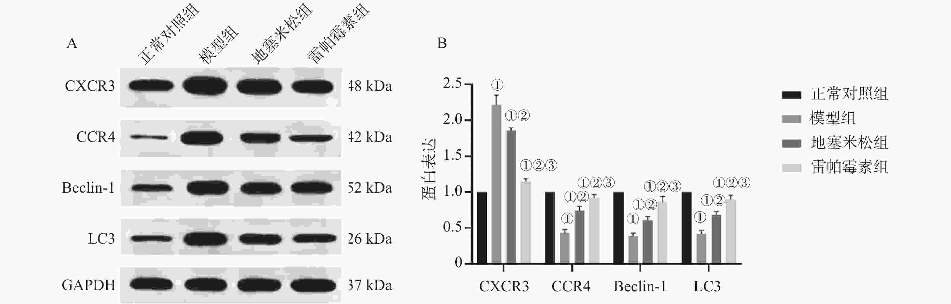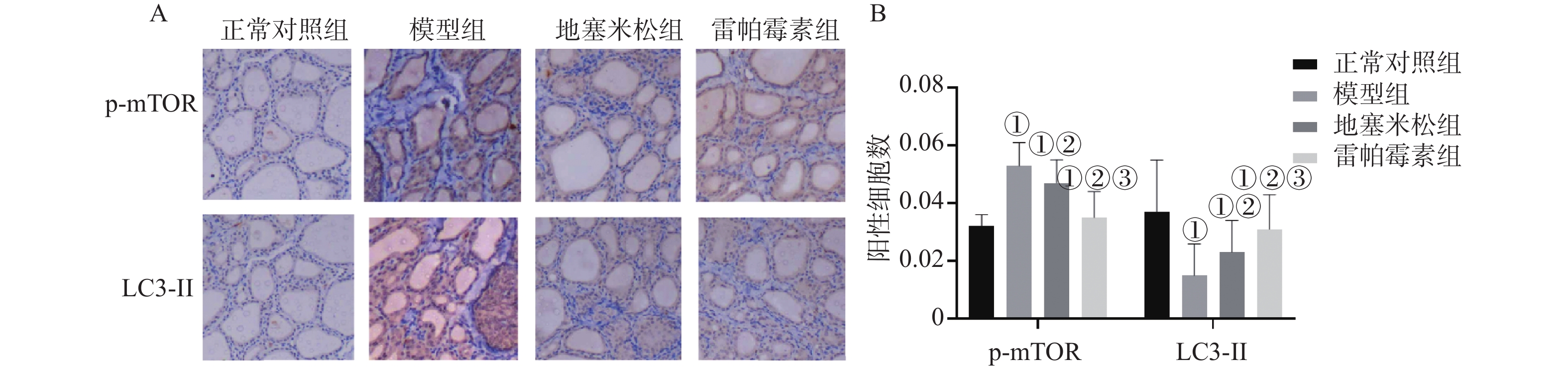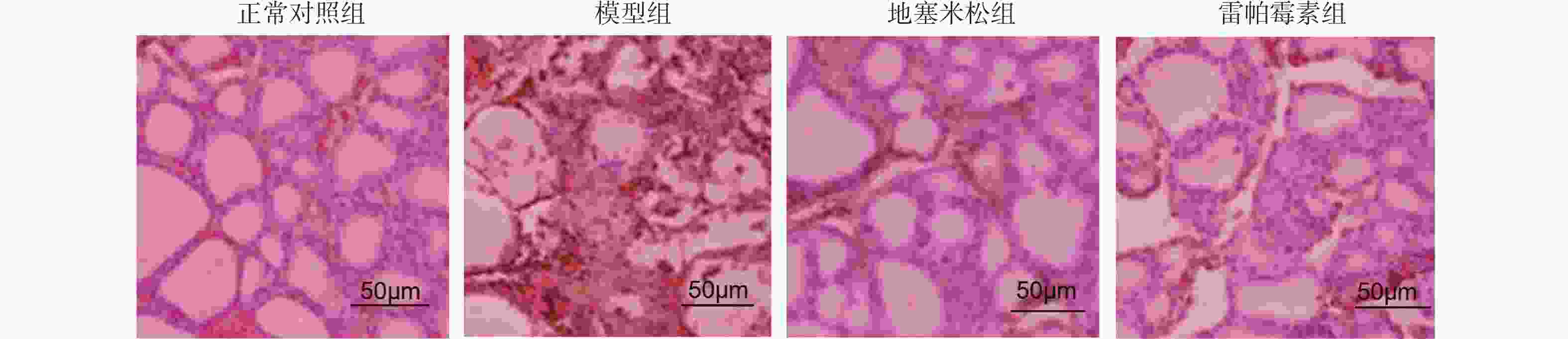目的 探讨雷帕霉素诱导氧化应激对甲状腺炎大鼠的影响。 方法 将40只大鼠随机分为正常对照组、模型组、地塞米松组、雷帕霉素组4组,每组10只。正常对照组除外,均构建甲状腺炎大鼠模型,雷帕霉素干预。比色法检测大鼠甲状腺组织中活性氧(ROS)、谷胱甘肽(GSH)水平;HE染色观察病理形态;PCR检测大鼠甲状腺组织中趋化因子受体(CXCR3)、C-C趋化因子受体(CCR4)表达;免疫组化检测大鼠甲状腺组织中雷帕霉素靶蛋白(mTOR)磷酸化水平、自噬蛋白微管相关蛋白1轻链3α-Ⅱ(LC3-Ⅱ)蛋白水平;蛋白免疫印迹检测大鼠甲状腺组织中CXCR3、CCR4、Beclin-1、LC3蛋白表达。 结果 与正常对照组相比,模型组大鼠甲状腺组织中ROS、CXCR3水平、CXCR3 mRNA表达及p-mTOR阳性细胞数升高(P < 0.05),GSH、CCR4、Beclin-1、LC3水平、CCR4 mRNA表达及LC3-Ⅱ阳性细胞数降低(P < 0.05),与模型组相比,地塞米松组和雷帕霉素组ROS、CXCR3水平、CXCR3 mRNA表达及p-mTOR阳性细胞数降低(P < 0.05),且雷帕霉素组低于地塞米松组(P < 0.05),GSH、CCR4、Beclin-1、LC3水平、CCR4 mRNA表达及LC3-Ⅱ阳性细胞数升高(P < 0.05),雷帕霉素组高于地塞米松组(P < 0.05)。 结论 雷帕霉素可改善氧化应激水平,抑制p-mTOR表达,提高LC3-Ⅱ水平及甲状腺炎大鼠的细胞自噬,调节CXCR3/CCR4蛋白表达。 Abstract:Objective To investigate the effect of rapamycin-induced oxidative stress on thyroiditis rats. Methods Forty rats were randomly divided into 4 groups : normal control group, model group, dexamethasone group and rapamycin group, with 10 rats in each group. Except for the normal control group, a rat model of thyroiditis was constructed and rapamycin was intervened. The levels of reactive oxygen species (ROS) and glutathione (GSH) in thyroid tissue of rats were detected by colorimetry. HE staining was used to observe the pathological morphology ; the expression of chemokine receptor (CXCR3) and C-C chemokine receptor (CCR4) in thyroid tissue of rats was detected by PCR. The phosphorylation level of rapamycin target protein (mTOR) and the level of autophagy protein microtubule-associated protein 1 light chain 3α-II (LC3-II) protein in thyroid tissue of rats were detected by immunohistochemistry. Western blot was used to detect the expression of CXCR3, CCR4, Beclin-1 and LC3 protein in thyroid tissue of rats. Results Compared with the normal control group, the levels of ROS, CXCR3, CXCR3 mRNA expression and the number of p-mTOR positive cells in the thyroid tissue of the model group were increased (P < 0.05), while the levels of GSH, CCR4, Beclin-1, LC3, CCR4 mRNA expression and the number of LC3-II positive cells were decreased (P < 0.05). Compared with the model group, the levels of ROS, CXCR3, CXCR3 mRNA expression and the number of p-mTOR positive cells in the dexamethasone group and the rapamycin group were decreased (P < 0.05), and the rapamycin group was lower(P < 0.05). The levels of GSH, CCR4, Beclin-1 and LC3, the expression of CCR4 mRNA and the number of LC3-II positive cells increased (P < 0.05), and the rapamycin group was higher (P < 0.05). Conclusion Rapamycin can improve the level of oxidative stress, inhibit the expression of p-mTOR, increase the level of LC3-II and autophagy in rats with thyroiditis, and regulate the expression of CXCR3/CCR4 protein. -