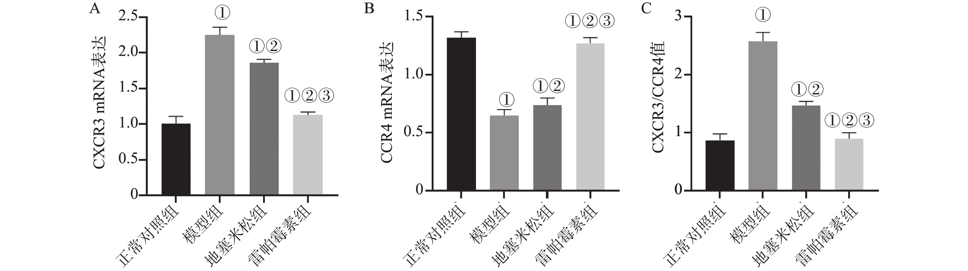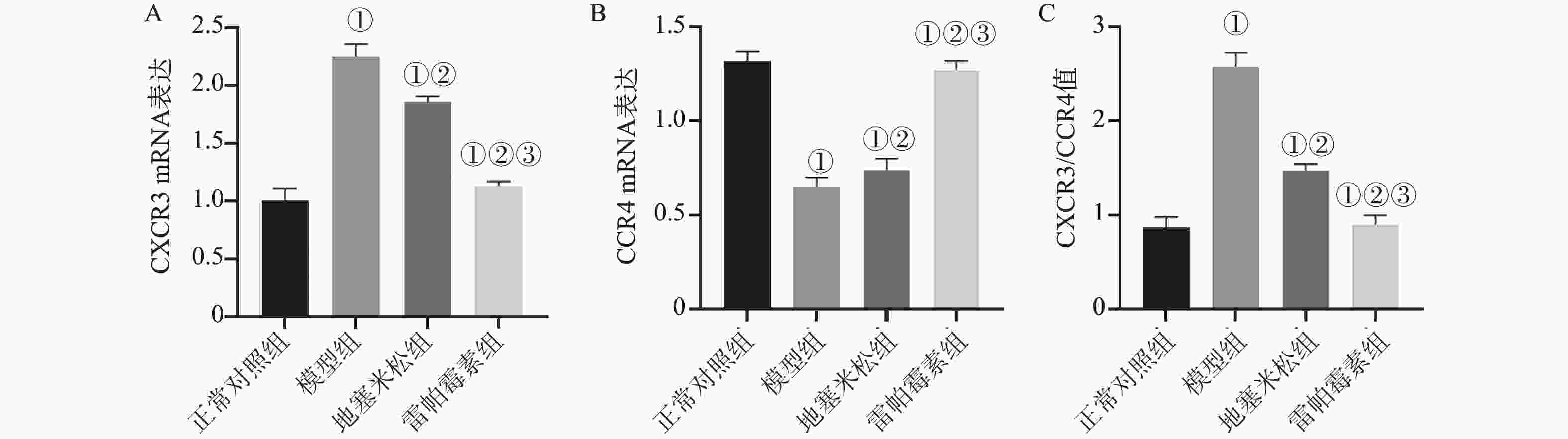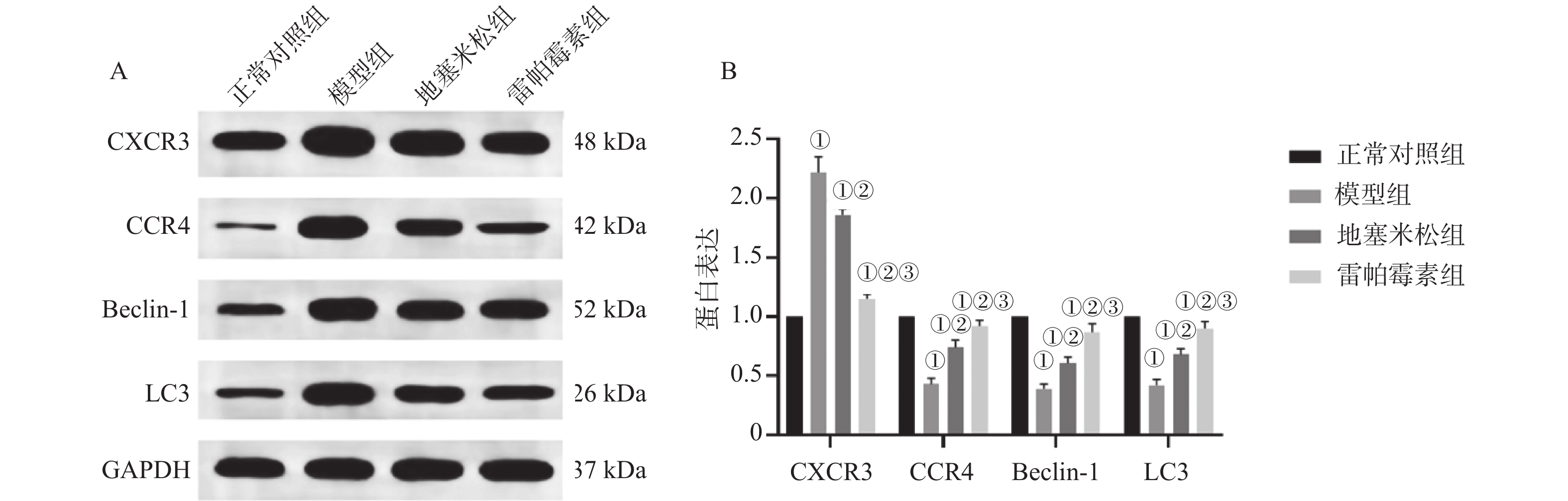 目的 探讨雷帕霉素诱导氧化应激对甲状腺炎大鼠的影响。 方法 将40只大鼠随机分为正常对照组、模型组、地塞米松组、雷帕霉素组4组,每组10只。正常对照组除外,均构建甲状腺炎大鼠模型,雷帕霉素干预。比色法检测大鼠甲状腺组织中活性氧(ROS)、谷胱甘肽(GSH)水平;HE染色观察病理形态;PCR检测大鼠甲状腺组织中趋化因子受体(CXCR3)、C-C趋化因子受体(CCR4)表达;免疫组化检测大鼠甲状腺组织中雷帕霉素靶蛋白(mTOR)磷酸化水平、自噬蛋白微管相关蛋白1轻链3α-Ⅱ(LC3-Ⅱ)蛋白水平;蛋白免疫印迹检测大鼠甲状腺组织中CXCR3、CCR4、Beclin-1、LC3蛋白表达。 结果 与正常对照组相比,模型组大鼠甲状腺组织中ROS、CXCR3水平、CXCR3 mRNA表达及p-mTOR阳性细胞数升高(P < 0.05),GSH、CCR4、Beclin-1、LC3水平、CCR4 mRNA表达及LC3-Ⅱ阳性细胞数降低(P < 0.05),与模型组相比,地塞米松组和雷帕霉素组ROS、CXCR3水平、CXCR3 mRNA表达及p-mTOR阳性细胞数降低(P < 0.05),且雷帕霉素组低于地塞米松组(P < 0.05),GSH、CCR4、Beclin-1、LC3水平、CCR4 mRNA表达及LC3-Ⅱ阳性细胞数升高(P < 0.05),雷帕霉素组高于地塞米松组(P < 0.05)。 结论 雷帕霉素可改善氧化应激水平,抑制p-mTOR表达,提高LC3-Ⅱ水平及甲状腺炎大鼠的细胞自噬,调节CXCR3/CCR4蛋白表达。 Abstract:Objective To investigate the effect of rapamycin-induced oxidative stress on thyroiditis rats. Methods Forty rats were randomly divided into 4 groups : normal control group, model group, dexamethasone group and rapamycin group, with 10 rats in each group. Except for the normal control group, a rat model of thyroiditis was constructed and rapamycin was intervened. The levels of reactive oxygen species (ROS) and glutathione (GSH) in thyroid tissue of rats were detected by colorimetry. HE staining was used to observe the pathological morphology ; the expression of chemokine receptor (CXCR3) and C-C chemokine receptor (CCR4) in thyroid tissue of rats was detected by PCR. The phosphorylation level of rapamycin target protein (mTOR) and the level of autophagy protein microtubule-associated protein 1 light chain 3α-II (LC3-II) protein in thyroid tissue of rats were detected by immunohistochemistry. Western blot was used to detect the expression of CXCR3, CCR4, Beclin-1 and LC3 protein in thyroid tissue of rats. Results Compared with the normal control group, the levels of ROS, CXCR3, CXCR3 mRNA expression and the number of p-mTOR positive cells in the thyroid tissue of the model group were increased (P < 0.05), while the levels of GSH, CCR4, Beclin-1, LC3, CCR4 mRNA expression and the number of LC3-II positive cells were decreased (P < 0.05). Compared with the model group, the levels of ROS, CXCR3, CXCR3 mRNA expression and the number of p-mTOR positive cells in the dexamethasone group and the rapamycin group were decreased (P < 0.05), and the rapamycin group was lower(P < 0.05). The levels of GSH, CCR4, Beclin-1 and LC3, the expression of CCR4 mRNA and the number of LC3-II positive cells increased (P < 0.05), and the rapamycin group was higher (P < 0.05). Conclusion Rapamycin can improve the level of oxidative stress, inhibit the expression of p-mTOR, increase the level of LC3-II and autophagy in rats with thyroiditis, and regulate the expression of CXCR3/CCR4 protein. -