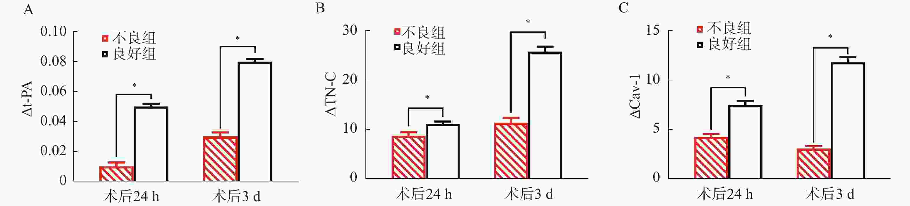 指标 术后24 h变化值 术后3 d变化值 △t-PA 术后24 h t-PA—术前t-PA 术后3 d t-PA—术前t-PA △TN-C 术前TN-C—术后24 h TN-C 术前TN-C—术后3 d TN-C △Cav-1 术前Cav-1—术后24 h Cav-1 术前Cav-1—术后3 d Cav-1 表 2 两组基线资料比较[($ \bar x \pm s $)/n(%)]
