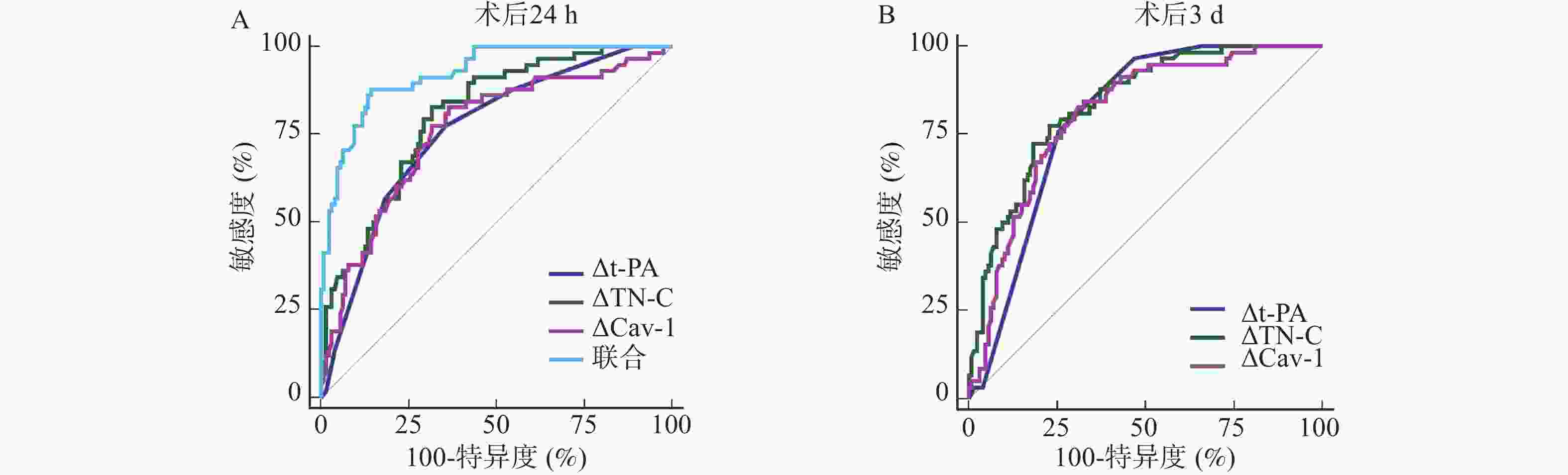 指标 AUC 95%CI cut-off值 敏感度(%) 特异度(%) P 术后24 h △t-PA 0.759 0.691~0.819 0.03 77.59 64.29 <0.001* △TN-C 0.804 0.739~0.859 10.31 82.76 68.25 <0.001* △Cav-1 0.760 0.691~0.819 5.90 82.76 63.49 <0.001* 术后3 d △t-PA 0.799 0.734~0.855 0.03 75.86 74.60 <0.001* △TN-C 0.836 0.774~0.886 13.79 77.59 76.98 <0.001* △Cav-1 0.807 0.742~0.861 4.27 84.48 67.46 <0.001* *P < 0.001。 -