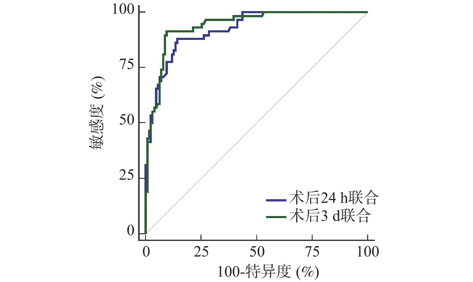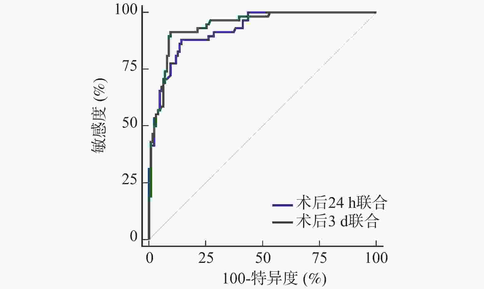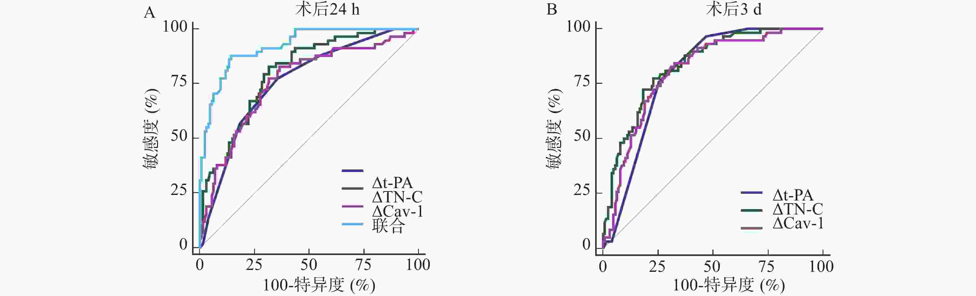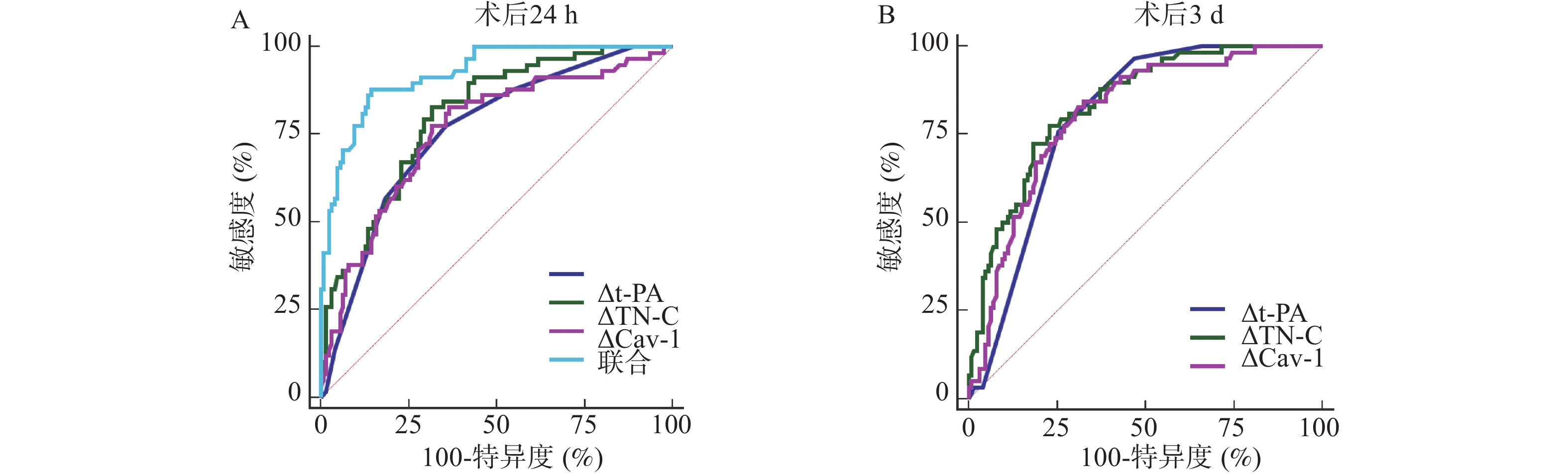 指标 AUC 95%CI cut-off值 敏感度(%) 特异度(%) P 术后24 h △t-PA 0.759 0.691~0.819 0.03 77.59 64.29 <0.001* △TN-C 0.804 0.739~0.859 10.31 82.76 68.25 <0.001* △Cav-1 0.760 0.691~0.819 5.90 82.76 63.49 <0.001* 术后3 d △t-PA 0.799 0.734~0.855 0.03 75.86 74.60 <0.001* △TN-C 0.836 0.774~0.886 13.79 77.59 76.98 <0.001* △Cav-1 0.807 0.742~0.861 4.27 84.48 67.46 <0.001* *P < 0.001。 -