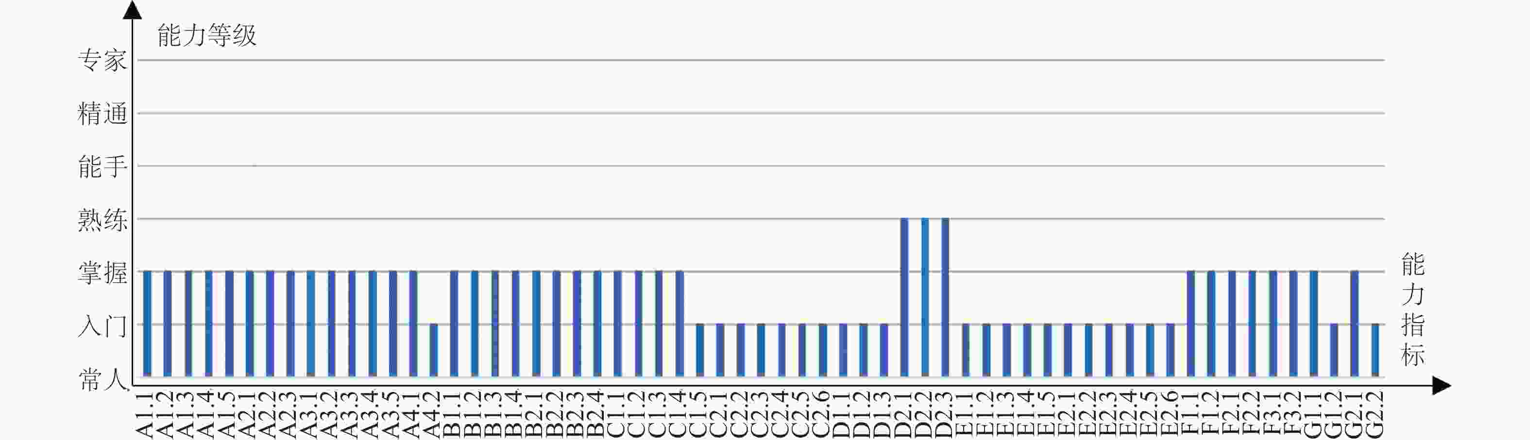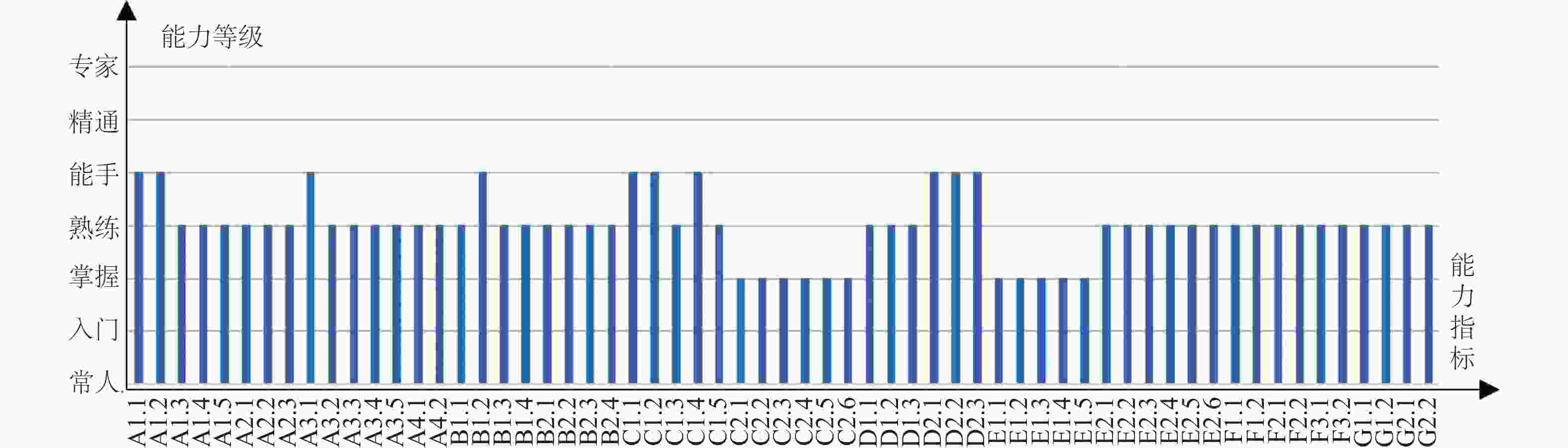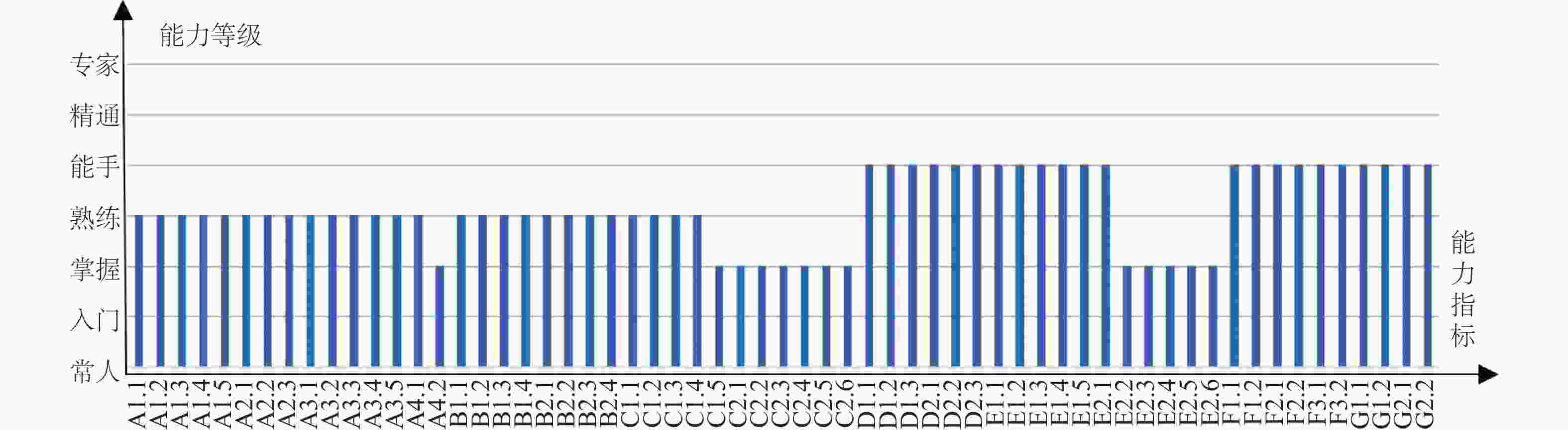 G2.2形成对行业(领域)有积极影响的成果或事迹 2.05 ± 0.22 0.11 2(2.00,2.00) 入门 3.80 ± 0.62 0.16 4(4.00,4.00) 熟练 3.75 ± 0.55 0.15 4(4.00,4.00) 熟练 4.85 ± 0.38 0.08 5(5.00,5.00) 能手