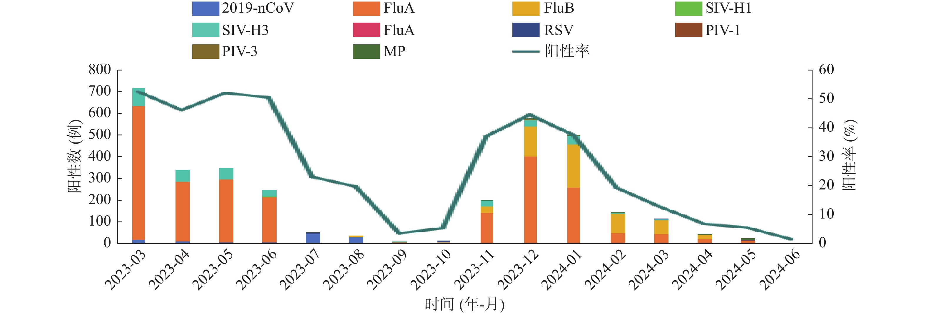 Objective Analyze the epidemiological characteristics of respiratory virus infections in Kunming area during 2023-2024, and explore the detection rates of different virus types and their distribution patterns across different time periods and age groups. Methods A total of 10354 nasopharyngeal swab or sputum samples were retrospectively collected from patients with acute respiratory infections who visited the Third People's Hospital of Kunming City between March 2023 and June 2024. Multiple pathogens were detected using real-time fluorescent quantitative polymerase chain reaction (RT-qPCR) technology. A retrospective analysis was then conducted on the clinical laboratory detection results, statistically analyzing the overall detection rates of various respiratory viruses, multiple infection phenomena, gender differences, age distribution, seasonal variations, infection site differences, and monthly infection situations. Results Among the 10354 patient respiratory samples tested, 3368 pathogen infections were detected, with a detection rate of 32.53% (3368 /10354 ). 204 patients presented with mixed infections of ≥2 pathogens, with a mixed detection rate of 6.06%(204/3368 ). The single detection rate for females was significantly higher than males (P < 0.001), and the multiple infection detection rate for males is significantly higher than females (P < 0.05), indicating that males may have a higher risk of concurrent infections. Among different age groups, the virus detection rate was highest in the 5-18 years age group at 55.87%. Significant differences were observed in the detection rates of FluA, FluB, and SIV-H3 across different disease types (P < 0.05). In March 2023, the detection rate was highest at 54.27% (5619 /10354 ), with Influenza A virus (FluA) and seasonal influenza H3 subtype (SIV-H3) being the most detected pathogens. Conclusion In acute respiratory infection (ARI) cases in the Kunming area, FluA, FluB, and SIV-H3 were the primary viral pathogens, with the region's viral epidemic characteristics closely related to patient age stages, seasonal changes, and infection site factors.