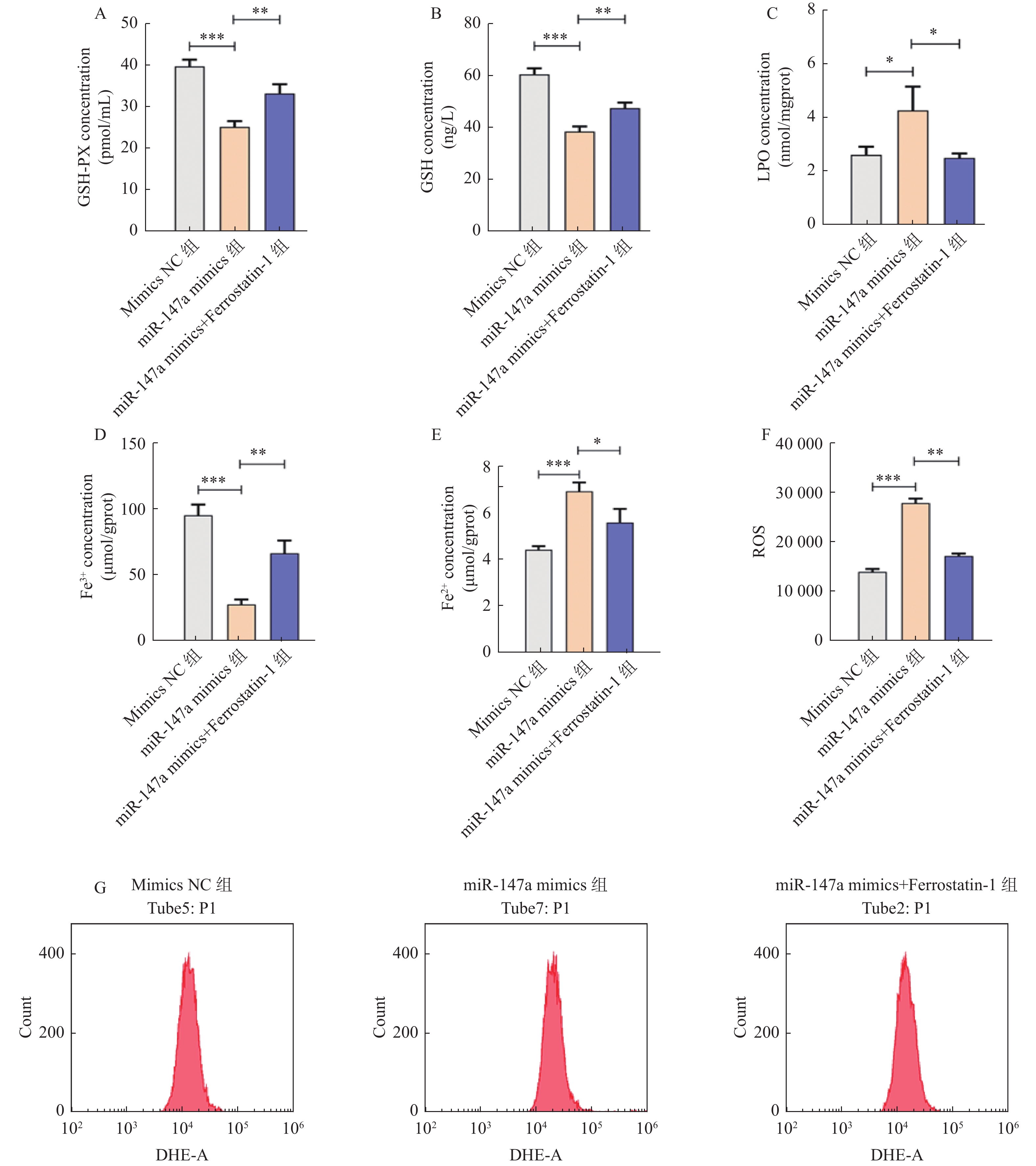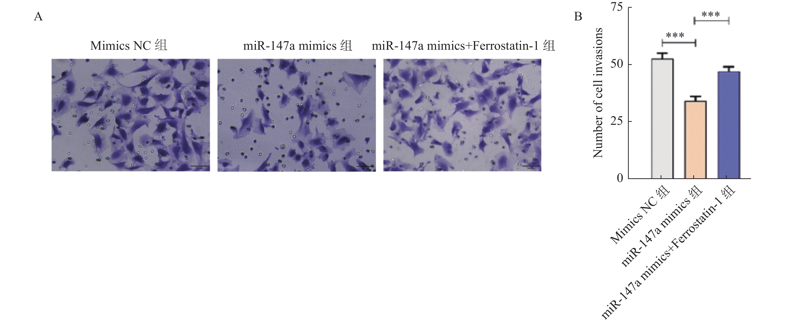 Objective To investigate the regulatory role of miR-147a in affecting cell proliferation and metastasis of cervical cancer Hela cells through ferroptosis. Methods Hela cells were cultured and passaged, and then a Hela single-cell suspension was prepared and transfected. After transfection, the cells were divided into control group, miR-147a mimics NC group, miR-147a mimics group, miR-147a inhibitor NC group, miR-147a inhibitor group, and miR-147a mimics+Ferrostatin-1 (1 μM) group. MTT assay was used to detect cell proliferation, Transwell assay to assess cell invasion capacity, scratch test to evaluate cell healing ability, flow cytometry to detect reactive oxygen species (ROS) expression, and assay kits to measure expression changes of ferrous ions (Fe2+), ferric ions (Fe3+), lactoperoxidase (LPO), glutathione peroxidase (GSH-PX), and glutathione (GSH). Results Compared to the control group, the miR-147a mimics group showed reduced cell proliferation rate, cell invasion quantity, and cell migration distance (P < 0.05); the miR-147a inhibitor group exhibited increased cell proliferation rate, cell invasion quantity, and cell migration distance (P < 0.05). Compared to the control group, the miR-147a mimics group showed increased Fe2+, LPO, and ROS expression, with decreased Fe3+, GSH-PX, and GSH expression (P < 0.05). The miR-147a inhibitor group showed decreased Fe2+ , LPO, and ROS expression, with increased Fe3+, GSH-PX, and GSH expression(P < 0.05). The miR-147a mimics + Ferrostatin-1 group exhibited increased cell proliferation rate, cell invasion quantity, and cell migration distance compared to the miR-147a mimics group (P < 0.05). Compared to the miR-147a mimics group, the miR-147a mimics + Ferrostatin-1 group showed decreased Fe2+, LPO, and ROS expression levels (P < 0.05), with increased Fe3+, GSH-PX, and GSH expression levels (P < 0.05). Conclusion miR-147a can promote ferroptosis and inhibit the proliferation and metastasis of cervical cancer cells.