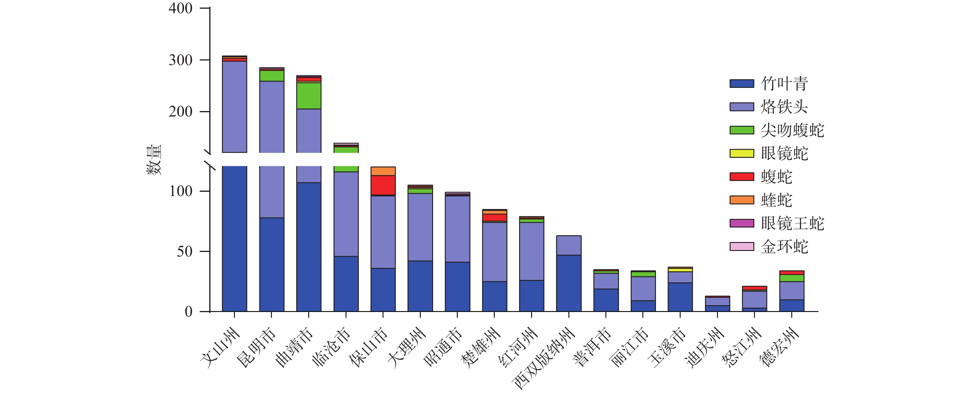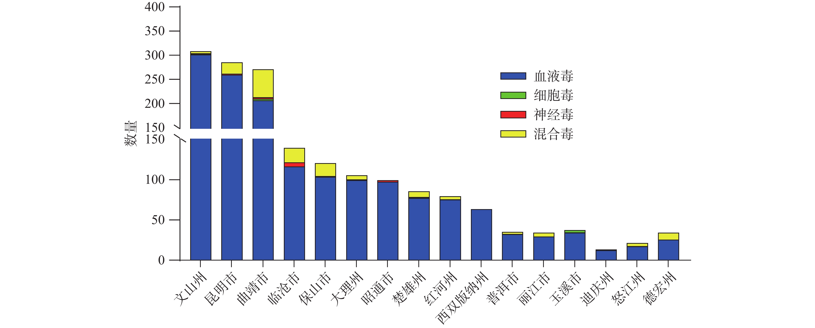 Objective To explore the epidemiological characteristics and treatment outcomes of venomous snake bites in Yunnan Province from 2023 to 2024. Methods A retrospective analysis was performed on 1, 727 snakebite cases collected from 16 administrative regions in Yunnan Province between January 2023 and December 2024, focusing on the following indicators: (1) demographic characteristics (age and gender distribution); (2) characteristics of injury events (location, time distribution, and affected body parts); (3) composition of venomous snake species; (4) clinical features and treatment protocols; (5) efficacy evaluation indicators (time for local symptom relief, duration of hospital stay, and follow-up results). Results High-incidence areas for snake bites in Yunnan Province included Wenshan (308/1727 ), Kunming (285/1727 ), Qujing (270/1727 ), Lincang (139/1727 ), Baoshan (120/1727 ), and Dali (105/1727 ), with incidents primarily occurring from June to September. The most frequently encountered venomous snake species were Ovophis and Trimeresurus, known for their hemotoxic venom. Bite victims were mainly young adults. Clinical manifestations primarily included pain and swelling, with bites mainly occurring on limbs and in mountainous or forested areas. Anti-venom treatment concentrated on anti-ancistrodon acutus serum. Swelling generally subsided within 2 (2, 3) days, with an average hospital stay of 4 (3, 5) days. 96.46% of patients receiving standardized treatment fully recovered, with a follow-up disability rate of 0.35%. Conclusion The incidents of venomous snake bites in Yunnan Province have significant regional and seasonal concentration, with Wenshan, Kunming, Qujing and other areas being high-risk areas. The peak period of incidents is from June to September in summer, and the main types of snakes causing injuries are those containing blood toxins; The victim group is mainly young people, and bites often occur in the limbs, with typical symptoms of pain and swelling; The main treatment is anti snake serum; Snake bite patients who receive formal diagnosis and treatment have a higher recovery rate and a lower follow-up disability rate, but there is still a need to raise public awareness of standardized diagnosis and treatment for snake bites.