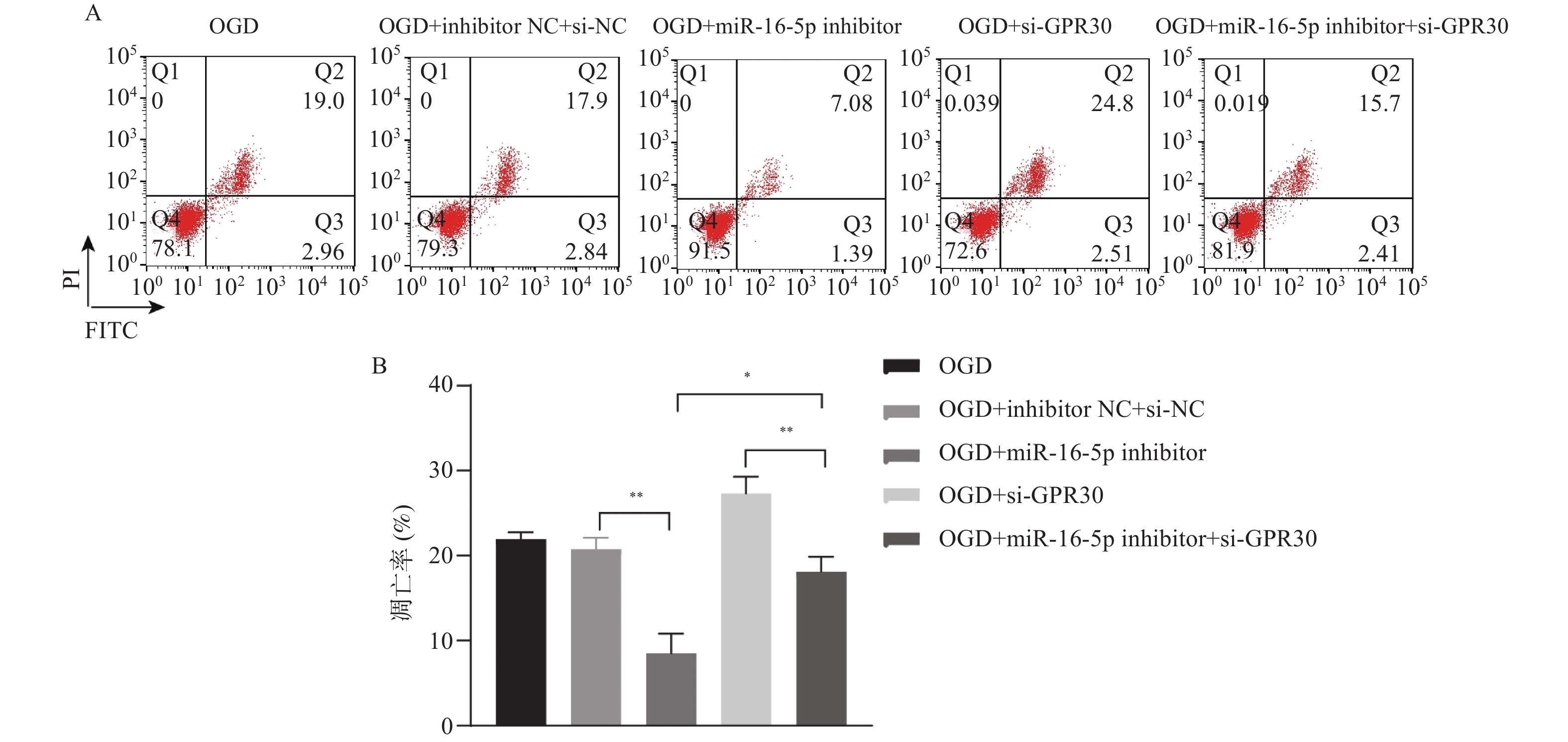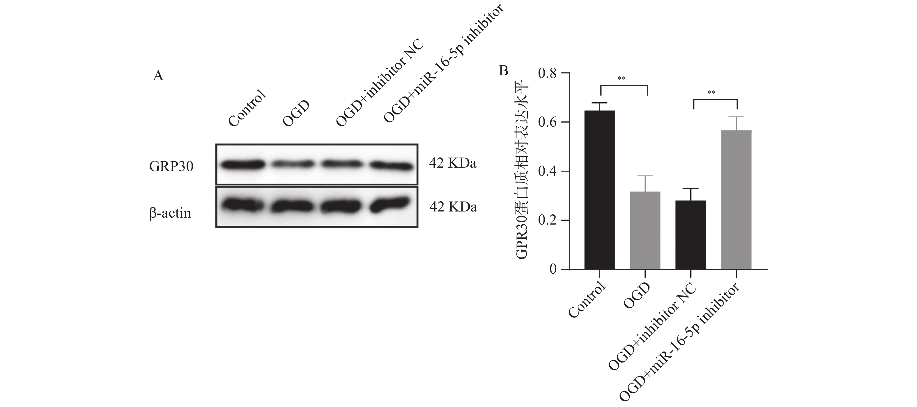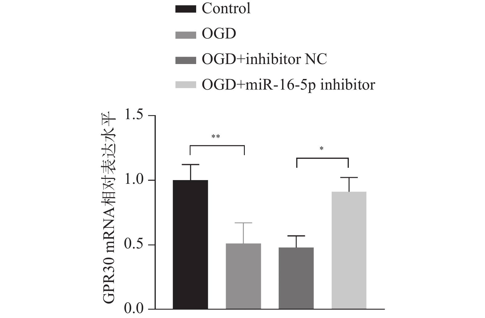 Objective To explore the molecular mechanism of miR-16-5p promoting apoptosis and inflammatory response by targeting GPR30 expression in an in vitro ischemic stroke microglia model (BV-2). Methods An ischemic stroke cell model was established by subjecting BV-2 cells to oxygen-glucose deprivation (OGD). qRT-PCR was utilized to assess the levels of miR-16-5p and GPR30 mRNA in OGD cells. A miR-16-5p inhibitor was transfected into OGD cells to silence miR-16-5p expression, and alterations in inflammatory response and apoptosis were measured using ELISA kits and Annexin V-FITC/PI staining. Starbase was employed to predict interactions, and dual-luciferase reporter gene assays were conducted to confirm that miR-16-5p targets the 3'-untranslated region (UTR) sequence of GPR30. Changes in cellular inflammatory response and apoptosis were evaluated by knocking down miR-16-5p and/or GPR30 in OGD cells. Results miR-16-5p expression was significantly elevated (P < 0.01), while GPR30 expression was notably decreased (P < 0.01) in OGD-induced cells. Knockdown of miR-16-5p reduced the expression levels of inflammatory factors and the cell apoptosis ratio (P < 0.01). Inhibition of miR-16-5p expression led to an upregulation of GPR30 mRNA and protein levels (P < 0.01). Simultaneous silencing of both miR-16-5p and GPR30 partially enhanced inflammatory factor expression levels and the cell apoptosis ratio compared to cells transfected solely with the miR-16-5p inhibitor (P < 0.05). Conclusion In the microglia OGD model, miR-16-5p triggers inflammatory responses and enhances apoptosis by inhibiting GPR30 expression.
