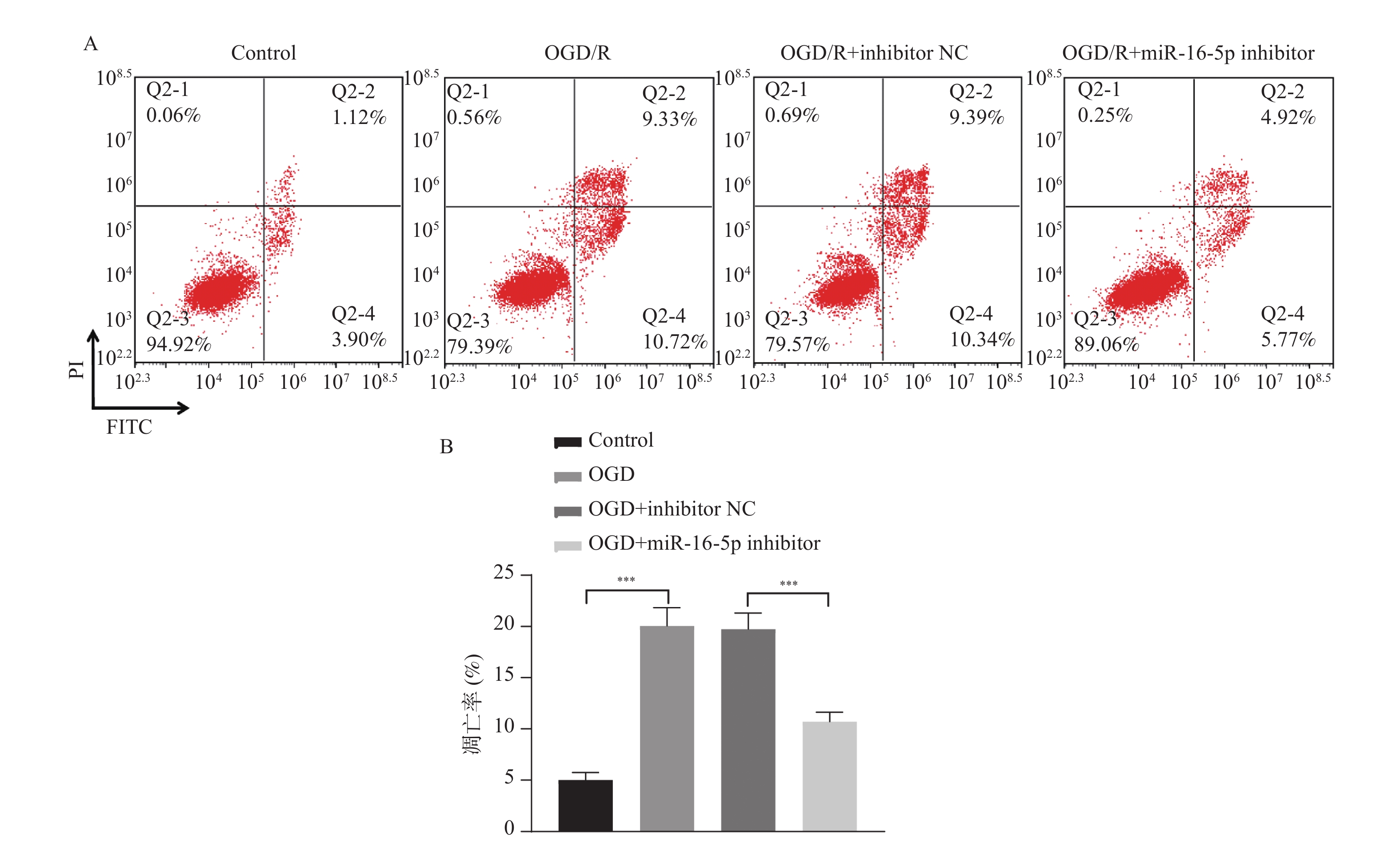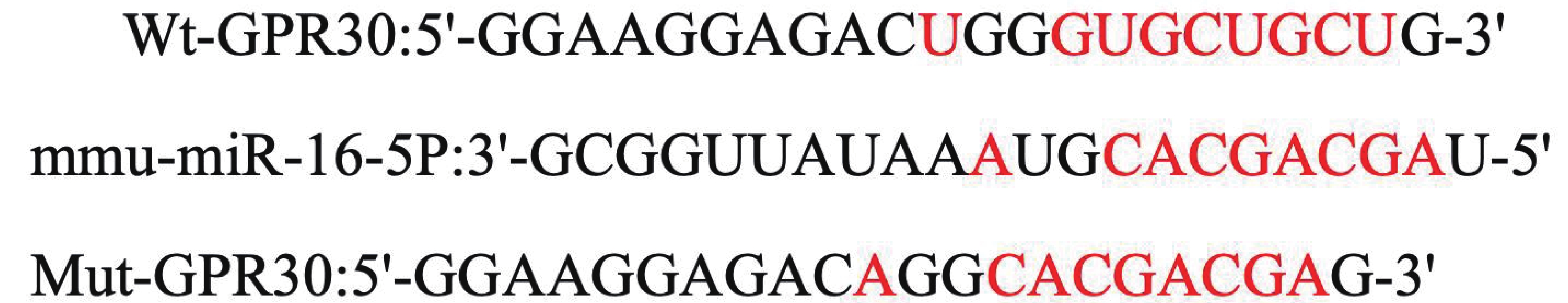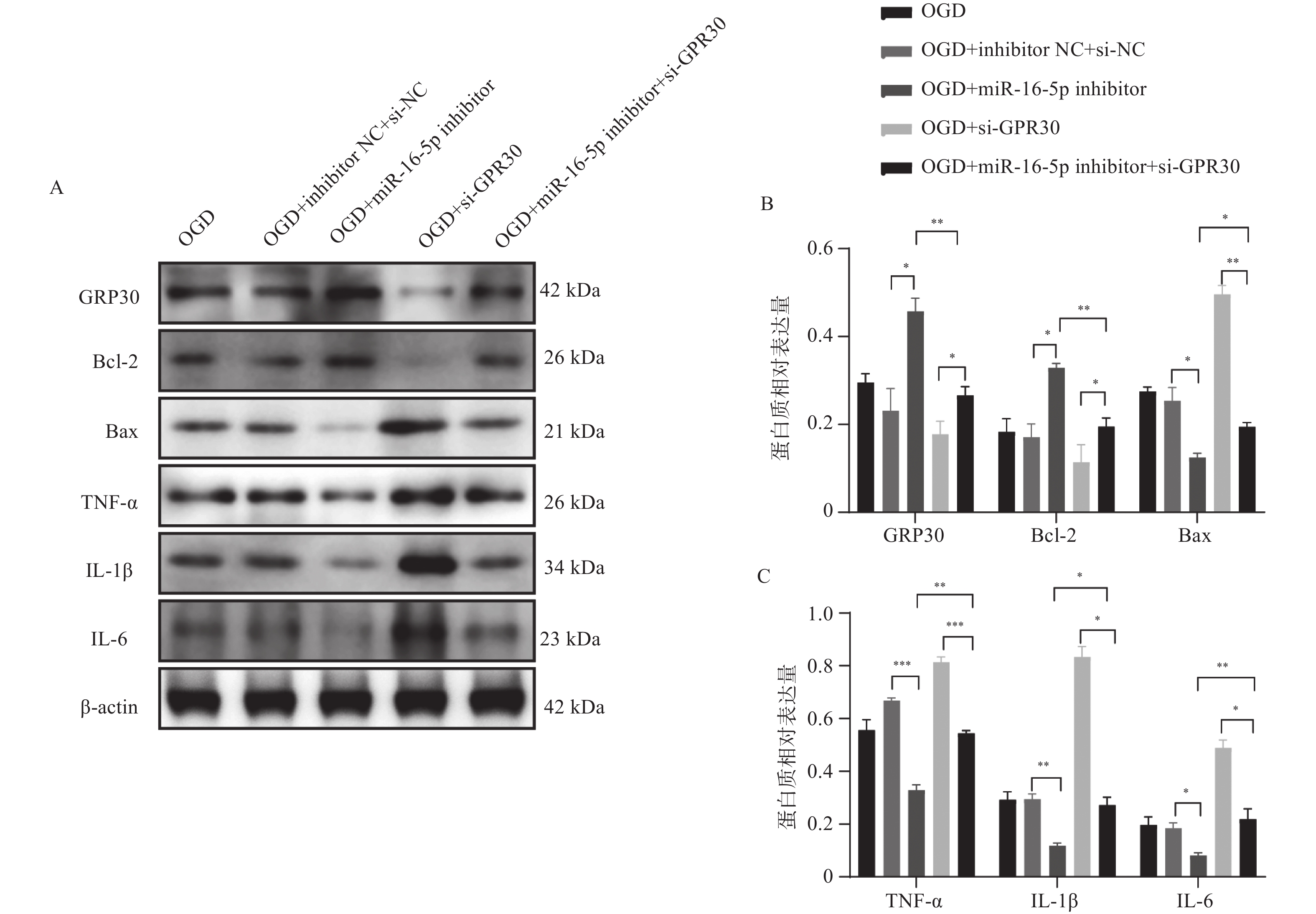 Objective To explore the molecular mechanism of miR-16-5p promoting apoptosis and inflammatory response by targeting GPR30 expression in an in vitro ischemic stroke microglia model (BV-2). Methods An ischemic stroke cell model was established by subjecting BV-2 cells to oxygen-glucose deprivation (OGD). qRT-PCR was utilized to assess the levels of miR-16-5p and GPR30 mRNA in OGD cells. A miR-16-5p inhibitor was transfected into OGD cells to silence miR-16-5p expression, and alterations in inflammatory response and apoptosis were measured using ELISA kits and Annexin V-FITC/PI staining. Starbase was employed to predict interactions, and dual-luciferase reporter gene assays were conducted to confirm that miR-16-5p targets the 3'-untranslated region (UTR) sequence of GPR30. Changes in cellular inflammatory response and apoptosis were evaluated by knocking down miR-16-5p and/or GPR30 in OGD cells. Results miR-16-5p expression was significantly elevated (P < 0.01), while GPR30 expression was notably decreased (P < 0.01) in OGD-induced cells. Knockdown of miR-16-5p reduced the expression levels of inflammatory factors and the cell apoptosis ratio (P < 0.01). Inhibition of miR-16-5p expression led to an upregulation of GPR30 mRNA and protein levels (P < 0.01). Simultaneous silencing of both miR-16-5p and GPR30 partially enhanced inflammatory factor expression levels and the cell apoptosis ratio compared to cells transfected solely with the miR-16-5p inhibitor (P < 0.05). Conclusion In the microglia OGD model, miR-16-5p triggers inflammatory responses and enhances apoptosis by inhibiting GPR30 expression.