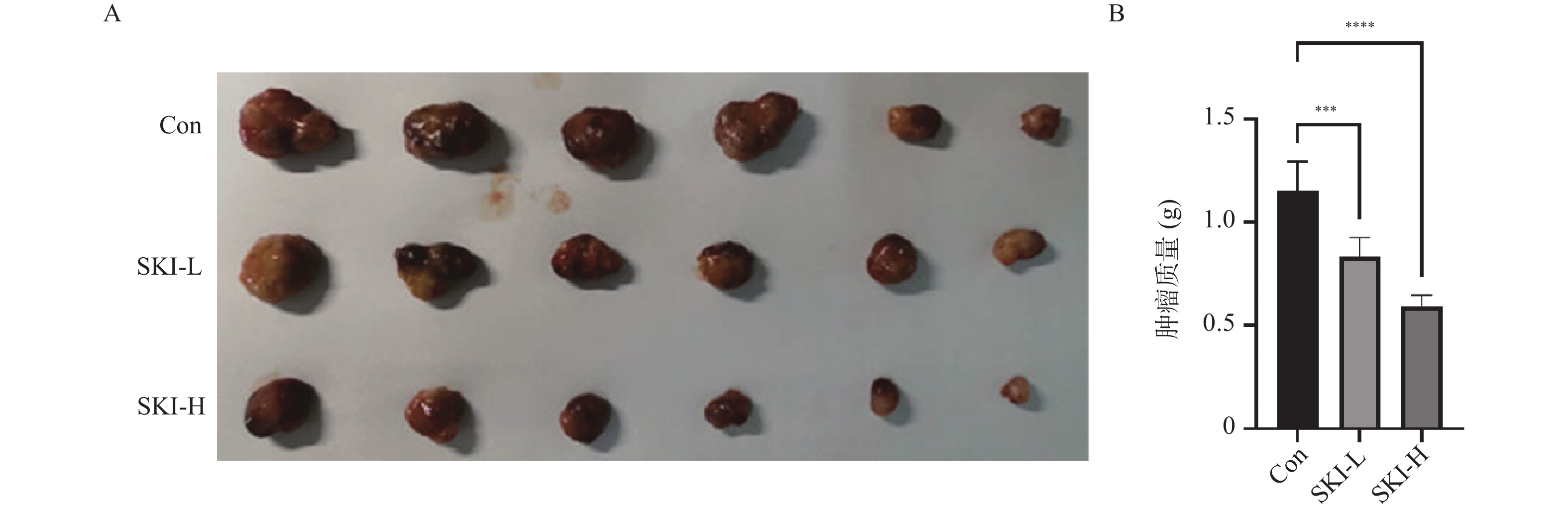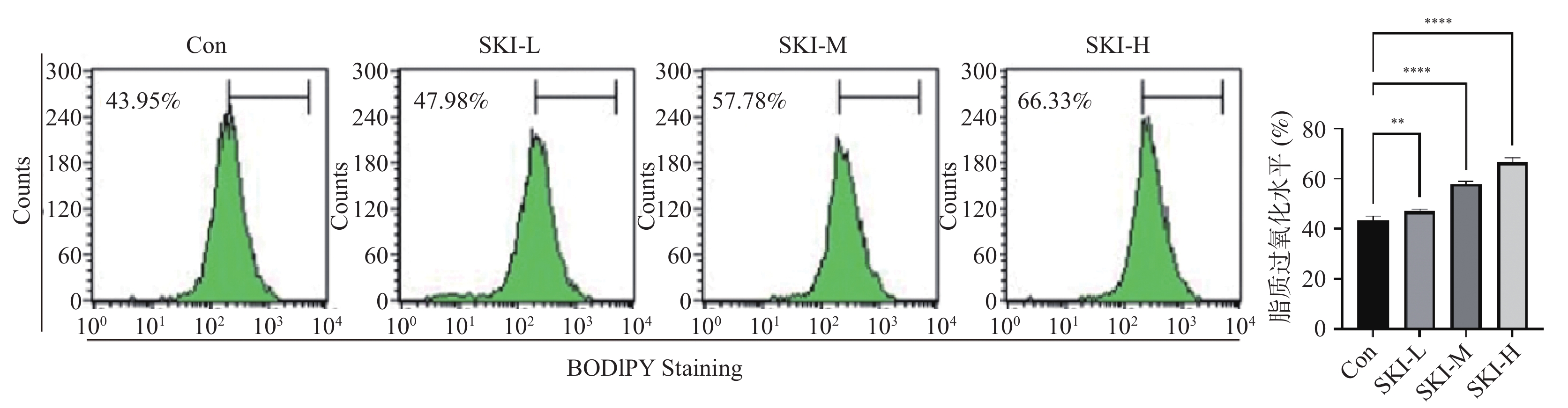 Objective To investigate if Shikonin (SKI) can induce ferroptosis via the ROS/JNK pathway to inhibit the malignant behavior of pancreatic cancer. Methods Human pancreatic cancer PANC-1 or BxPC-3 cells were selected. Drug efficacy experiments were established with a blank control group (Con group) and low, medium, and high dose SKI groups (2, 4, 8 μmol/L). JNK-related mechanism experiments were categorized into a blank control group (Con group), SKI group, and SKI+JNK inhibitor group (SKI+SP600125 group). ROS-related mechanism experiments were divided into a blank control group (Con group), SKI group, and SKI+ROS scavenger group (SKI+NAC group). Cell viability was assessed using the CCK-8 method to calculate IC50; Transwell experiments evaluated cell migration and invasion capabilities; the C11 BODIPY 581/591 probe was utilized for flow cytometry to detect lipid peroxidation levels, while the FerroOrange fluorescent probe measured ferrous ion levels; ROS levels were determined using a ROS detection kit; the Western blot method identified ferroptosis-related key proteins (SLC7A11, GPX4), apoptosis-related proteins (Caspase3, PARP), and JNK pathway proteins (JNK, p-JNK); an in vivo xenograft tumor model was employed to assess tumor proliferation. Results SKI treatment significantly and dose-dependently inhibited PANC-1 cell viability (IC50: 6.04 μmol/L, P < 0.0001 ) and BxPC-3 cell viability (IC50: 12.27 μmol/L, P < 0.0001 ), and significantly reduced migrating and invasive cell numbers (P < 0.0001 ), with migration cell numbers dropping to about 30% of the control group at 8 μmol/L SKI treatment (P < 0.0001 ). Mechanistically, SKI induced increased intracellular lipid peroxidation, Fe2+ accumulation, and significant ROS production (P < 0.0001 ), significantly downregulated SLC7A11 and GPX4 protein expression (GPX4 protein expression reduced to 40% of that in the control group, P < 0.0001 ), and activated JNK phosphorylation (p-JNK/JNK ratio increased to 2.8-fold, P < 0.0001 ). Pretreatment with the JNK-specific inhibitor SP600125 or ROS scavenger NAC effectively reversed SKI's inhibition of cell viability and downregulation of SLC7A11/GPX4 protein (all P < 0.01). SKI also inhibited pancreatic cancer tumor cell proliferation in vivo (P < 0.0001 ). Conclusion SKI induces ferroptosis by activating the ROS/JNK pathway, thereby inhibiting pancreatic cancer proliferation, migration, and invasion.
