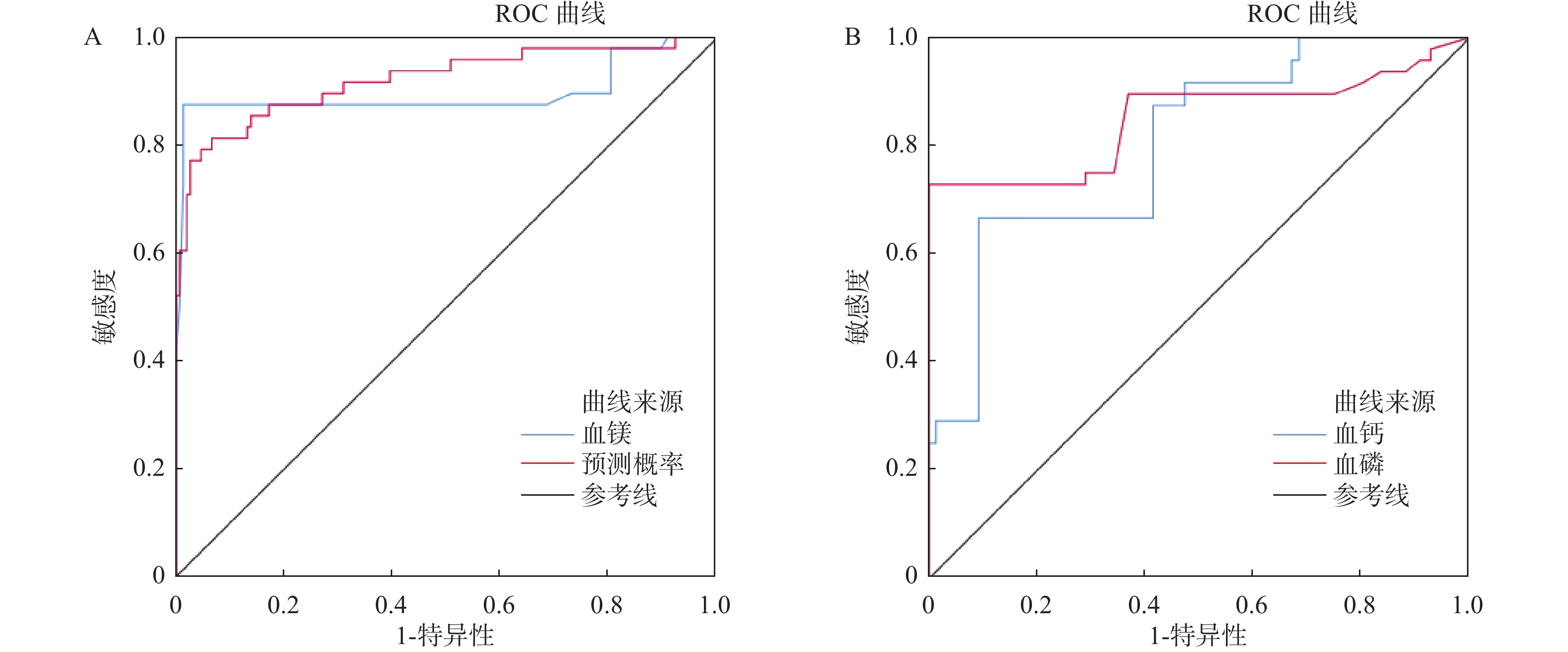 Objective To investigate the association between serum magnesium levels, serum phosphorus concentrations, vascular calcification, and cardiovascular disease mortality in maintenance hemodialysis patients. Methods This study enrolled 200 hemodialysis patients admitted to Nanjing Drum Tower Hospital from May 2020 to May 2022 as subjects, with an additional 200 healthy individuals from the same period selected as a control group. The biochemical indicators between the two groups were compared; their correlations were analyzed. Binary logistic regression was used to investigate the independent factors of serum magnesium and phosphorus levels in relation to vascular calcification and cardiovascular events in maintenance hemodialysis patients. ROC curve analysis was employed to assess the predictive value of serum magnesium and phosphorus for vascular calcification and cardiovascular events. Results The research group's patients exhibited significantly elevated levels of blood phosphorus, calcium-phosphorus product, iPTH, AACS, and 25-(OH)-VitD compared to the control group. In contrast, their blood magnesium and BMP-7 levels were notably lower than those of the control group, with statistical significance (P < 0.05). Pearson correlation showed positive correlations between serum magnesium and serum calcium, phosphorus, calcium-phosphorus product, 25-(OH)-VitD3, and BMP-7 (r = 0.385, 0.183, 0.141, 0.131, 0.458, P < 0.05); between serum calcium and serum phosphorus, calcium-phosphorus product, iPTH, AACS, 25-(OH)-VitD3, and BMP-7 (r = 0.318), correlation (r = 0.318, 0.311, 0.098, 0.170 , 0.277, 0.485, P < 0.05); between serum phosphorus and calcium-phosphorus product, iPTH, AACS, 25-(OH)-VitD3 (r = 0.362, 0.506, 0.367, 0.461, P < 0.05); between calcium-phosphorus product and iPTH, AACS, 25-(OH)-VitD3 (r = 0.542, 0.373, 0.434, P < 0.05); between iPTH and AACS, 25-(OH)-VitD3 showing positive correlations (r = 0.553, 0.616, P < 0.05) and a negative correlation with BMP-7 (r = -0.373, P < 0.05); between AACS and 25-(OH)-VitD3 showing a positive correlation (r = 0.402, P < 0.05), and a negative correlation with BMP-7 (r = -0.155, P < 0.05), with statistically significant differences (P < 0.05). Statistically significant differences were noted between the two groups in age, diabetes, serum magnesium, serum calcium, serum phosphorus, calcium-phosphorus product, 25-(OH)-VitD3, and hs-CRP (P < 0.05). Logistic regression analysis showed that age, serum magnesium, serum calcium, serum phosphorus, calcium phosphate product, 25- (OH) -vitamin I were all risk factors for cardiovascular disease (CVD) mortality in maintenance hemodialysis (MHD) patients (P <0.05). ROC curve analysis showed that serum magnesium, serum calcium, and serum phosphorus had predictive areas under the curve (AUC) of 0.895, 0.802, and 0.851 for CVD mortality in MHD patients, with sensitivities and specificities of 87.5%/98.7%, 66.7%/90.8%, and 72.9%/100%, respectively. The combined prediction for CVD mortality in MHD patients showed an AUC of 0.921, with a sensitivity of 81.3% and specificity of 93.4%. Conclusion MHD patients exhibit low blood magnesium levels, elevated serum phosphorus concentrations, and increased calcium-phosphorus product, with complex correlations among these biomarkers. Age, magnesium, calcium, and phosphorus levels were all associated with CVD mortality. ROC curve analysis demonstrates that magnesium, calcium, and phosphorus, both individually and in combination, have high predictive value for CVD mortality risk.