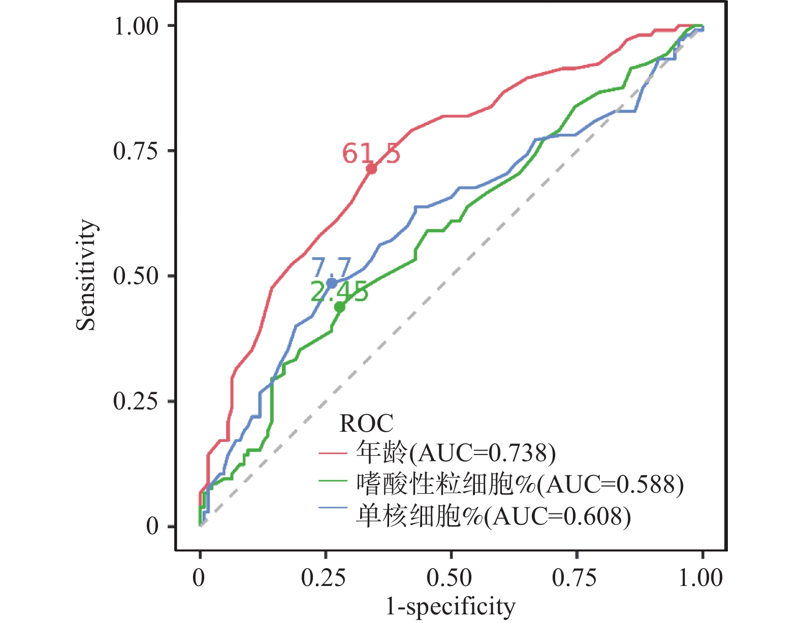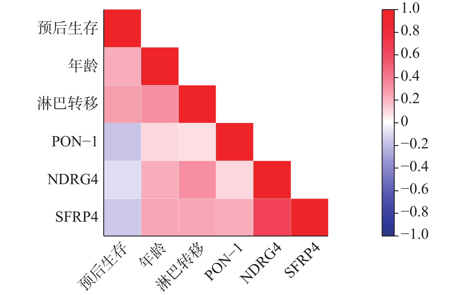 Objective To explore the intrinsic relationship between serum Paraoxonase-1 (PON-1), N-Myc downstream-regulated gene 4 (NDRG4), secreted frizzled-related protein 4 (SFRP4) expression levels, peripheral blood immune cell distribution, and prognosis in patients with gastric cancer. Methods Clinical data from 187 gastric cancer patients diagnosed and treated at Rizhao Lanshan District People's Hospital between April 2020 and August 2023 were selected as the case group, with 180 suspected patients from the same period serving as the control group. Fasting venous blood was collected from all study subjects, and enzyme-linked immunosorbent assay (ELISA) was utilized to measure serum PON-1, NDRG4, and SFRP4 expression levels. Flow cytometry was employed to detect the proportions of various immune cells in the peripheral blood of the case group, providing a comprehensive evaluation of peripheral blood immune cell distribution. Survival information was gathered through follow-up, and overall survival (OS) was recorded. The case group was divided into high and low expression groups based on the median serum biomarker expression, allowing for a comparison of immune status and prognostic differences between groups. The Kaplan-Meier method and Cox proportional hazards regression model were used to analyze the correlation between markers and prognosis, while Spearman analysis was employed to assess the association between indicators and survival prognosis. Results Compared to the control group, the case group showed no statistically significant differences in age, gender, and BMI (P > 0.05), but exhibited increased expression of PON-1, SFRP4, and CD8+ T cells, alongside decreased expression of NDRG4, CD3+ T, CD4+ T, B lymphocytes, and NK cells (P < 0.05). After grouping by median values, the PON-1 high expression group demonstrated a lower proportion of CD8+ T cells compared to the low expression group (P < 0.05), while the NDRG4 high expression group had a higher proportion of CD4+ T cells than the low expression group (P < 0.05). Additionally, the SFRP4 high expression group exhibited a lower proportion of CD4+ T and NK cells compared to the low expression group (P < 0.05). Univariate Cox regression analysis revealed that age, PON-1, NDRG4, SFRP4 expression, and lymph node metastasis were associated with the prognosis of gastric cancer patients (P < 0.05). Cox regression analysis indicated that NDRG4≥0.85ng/mL, lymph node metastasis, PON-1<120.56 pg/mL, SFRP4≥210.32 pg/mL, and age≥60 years were risk factors for mortality in gastric cancer patients (P < 0.05). By the end of follow-up, 61 out of 187 gastric cancer patients had died, with a median survival of 14.5 months (3~24 months). Kaplan-Meier analysis showed that the PON-1 high expression group had a median survival of 16.00 (12.75, 21.00) months, significantly longer than the low expression group’ s 15.00 (15.00, 16.00) months (P < 0.01); the NDRG4 high expression group had a median survival of 12.00 (10.00, 14.00) months, significantly shorter than the low expression group's 17.50 (13.00, 20.00) months (P < 0.01); the SFRP4 high expression group had a median survival of 9.00 (8.00, 12.00) months, significantly shorter than the low expression group's 19.00 (15.00, 22.00) months (P < 0.01). Spearman analysis revealed that age, lymph node metastasis, NDRG4, and SFRP4 were positively correlated with survival prognosis (P < 0.05), while PON-1 was negatively correlated (P < 0.05). Conclusion Serum PON-1, NDRG4, and SFRP4 expression levels in gastric cancer patients are closely related to peripheral blood immune cell distribution, exhibit clear interrelationships, and critically impact patient prognosis, providing potential reference indicators for gastric cancer prognosis assessment.