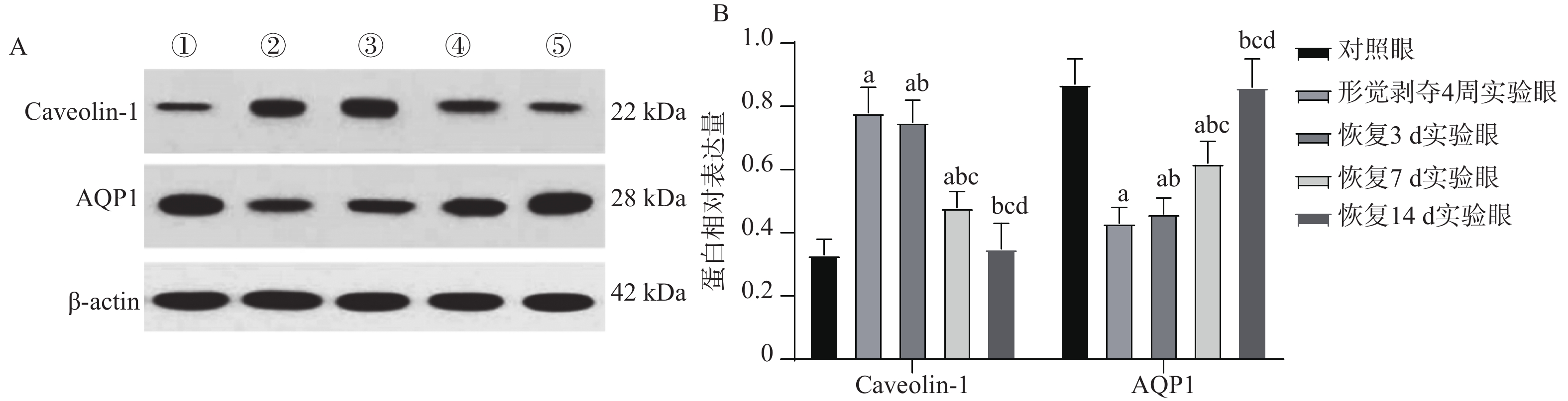 Objective To investigate the mechanism of collagen-related integrins α1, α2 and β1 on the Caveolin-1 (Cav-1)/aquaporin 1 (AQP1) signaling pathway during scleral remodeling in the recovery phase of form-deprivation myopia (FDM). Methods 50 guinea pigs were randomly divided into a study group (n = 40) and a control group (n = 10). The study group underwent FDM induction with monocular occlusion for 4 consecutive weeks. After removing the eye cover, FDM guinea pig models at different recovery time points were established: 4-week deprivation, 3-day recovery, 7-day recovery, and 14-day recovery (n = 10 each). The contralateral eye of study group animals served as internal control, and both eyes of the 10 control group animals served as normal control. Refraction and axial length of control eyes, 4-week deprivation eyes, 3-day recovery eyes, 7-day recovery eyes, and 14-day recovery eyes were measured. RT-PCR was used to detect the mRNA expression of collagen-related integrin α1, α2, and β1 in the scleral tissue; electron microscopy was used to observe the ultrastructure of the sclera; HE staining was used to observe the morphology of the sclera; and immunoblotting was used to detect the expression of Caveolin-1 and AQP1 proteins in the scleral tissue. Results Compared with the control eyes, 4-week deprivation eyes, 3-day recovery eyes, and 7-day recovery eyes showed decreased refraction and AQP1 protein, with increased axial length and Caveolin-1 (P < 0.05). At 14-day recovery, no significant changes were observed (P > 0.0083). Compared with 4-week deprivation and 3-day recovery eyes, 7-day recovery eyes showed elevated refraction and AQP1 protein expression, with decreased axial length and Caveolin-1 (P < 0.05). No significant differences were found between 4-week deprivation and 3-day recovery eyes (P > 0.0083). Compared with control eyes, Integrinα1, α2, and β1 mRNA levels were decreased in 4-week deprivation, 3-day recovery, and 7-day recovery eyes (P < 0.05), with no significant changes at 14-day recovery (P > 0.0083). Compared with 4-week deprivation eyes, Integrinα1, α2 and β1 mRNA levels increased in 3-day and 7-day recovery eyes, with the highest levels at 7-day recovery (P < 0.05). Electron microscopy showed improved collagen fibril distribution in 7-day and 14-day recovery eyes, with 14-day recovery eyes showing near-normal distribution. HE staining revealed that 14-day recovery eyes had near-normal scleral morphology. Conclusion During scleral remodeling in the recovery period of form-deprivation myopia, collagen-related integrins α1, α2 and β1 may directly or indirectly regulate the Caveolin-1/AQP1 pathway, affecting water transport and signal transduction in scleral cells, thereby participating in scleral remodeling.