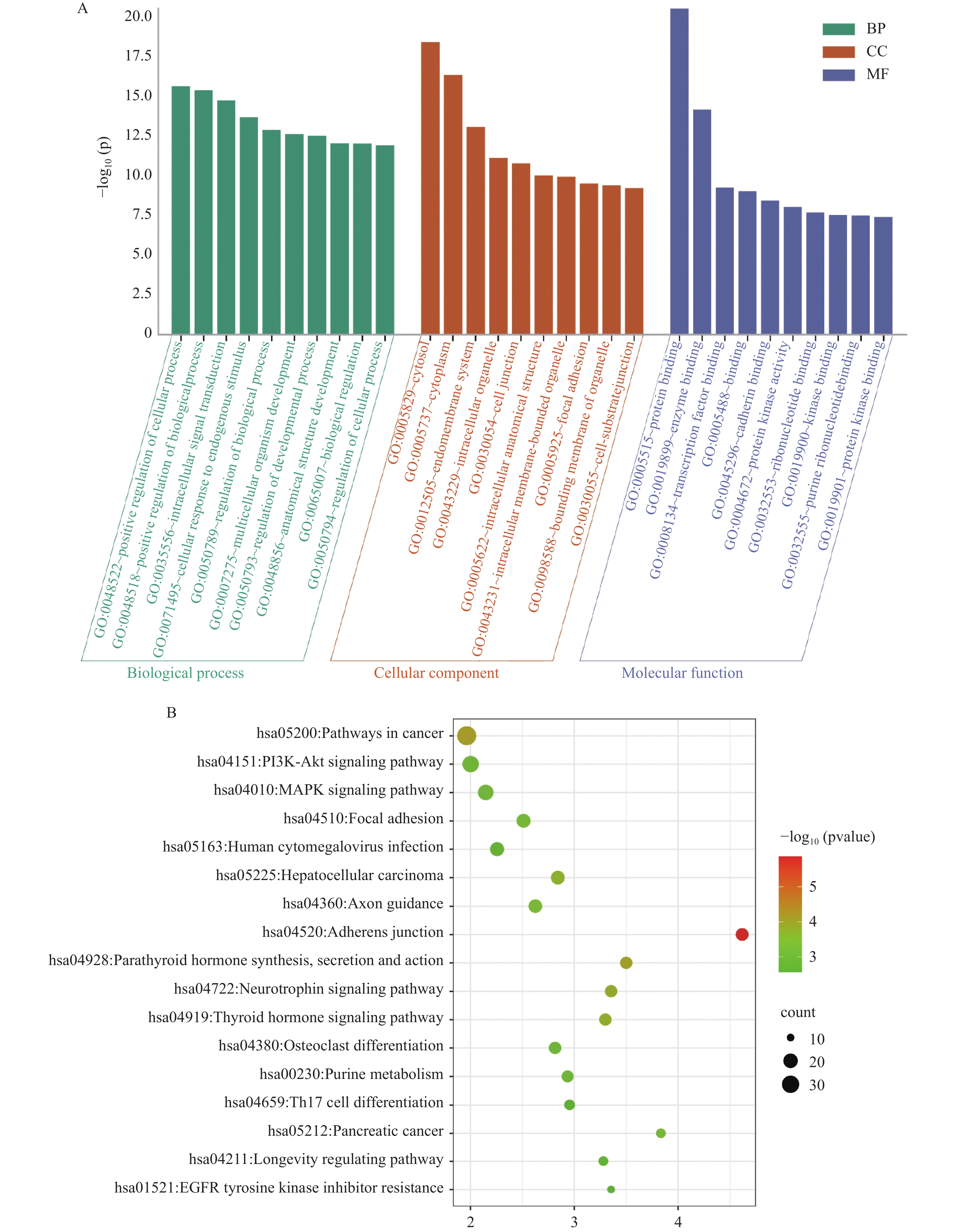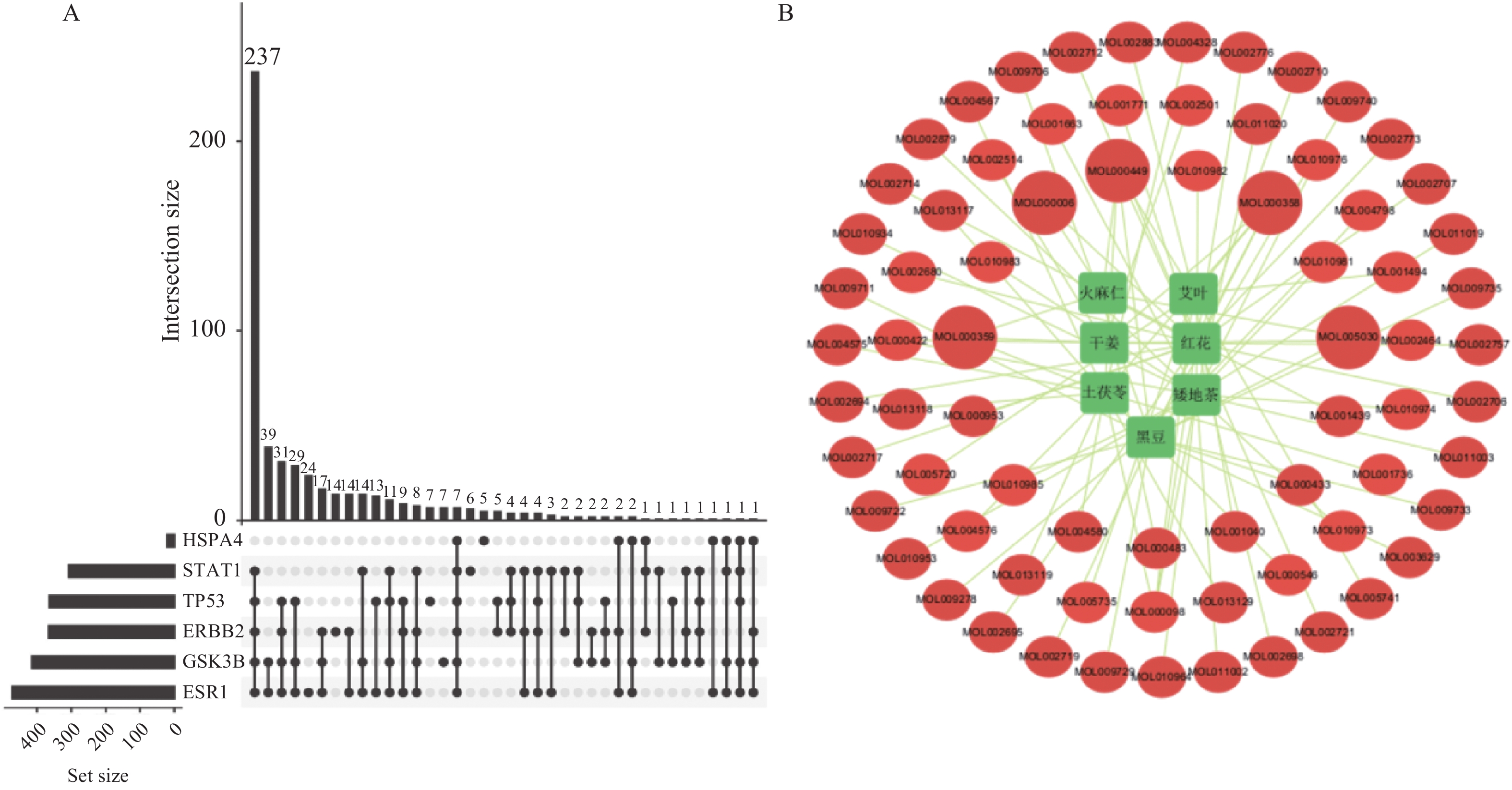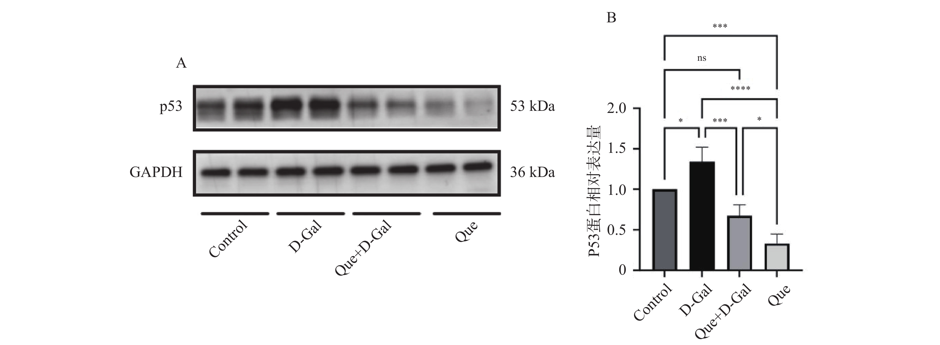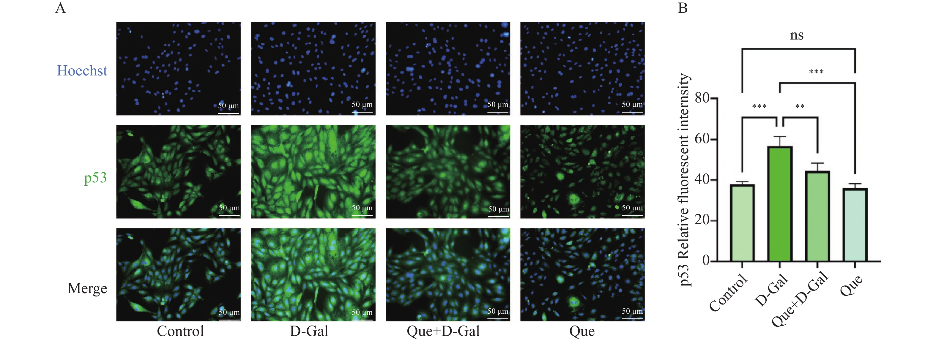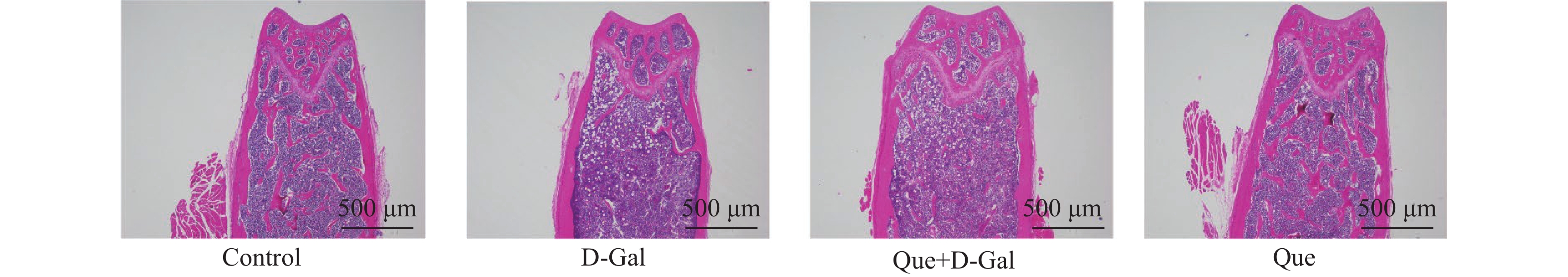 Objective To explore potential active components of Chinese herbal medicines (CHMs) for treating bone aging and their mechanisms of action using reverse network pharmacology and molecular docking techniques, with preliminary experimental validation. Methods Transcriptomic data were obtained from the GEO database. GEO2R was used to analyze differentially expressed genes, identifying a characteristic bone aging gene set. A Protein-Protein Interaction (PPI) network was constructed to identify key targets, followed by Gene Ontology (GO) and Kyoto Encyclopedia of Genes and Genomes (KEGG) enrichment analyses. Core disease targets were identified by intersecting results from three algorithms (Degree, MCC, and Stress). These core targets were used to reversely identify CHMs with potential anti-bone aging effects, followed by drug activity analysis. Molecular docking was performed between active components and core disease targets to further screen representative compounds. Senescent bone cell models and animal models were established for preliminary efficacy verification. Cell experiments were divided into 4 groups: control group (Control), bone aging group (D-Gal), quercetin + bone aging group (Que+D-Gal), and quercetin group (Que). An aging bone cell model was constructed using D-galactose (10 g/L), and quercetin (10 µM) was used to treat D-Gal-induced senescent cells. Cellular senescence was observed by SA-β-Gal staining, and p53 protein expression was detected by immunofluorescence and Western blot. Twenty-four C57BL/6J mice were randomly divided into 4 groups (6 mice per group) with the same grouping as cells. A bone aging mouse model was established via subcutaneous injection of D-galactose (500 mg/kg) on the dorsal neck, and quercetin (50 mg/kg) was administered by gavage. HE staining of femoral sections was used to observe bone protective effects. Results A total of 669 characteristic bone aging genes were identified, primarily enriched in as PI3K-AKT, MAPK, osteoclast differentiation, and longevity regulation pathways. Core targets were TP53, HSPA4, ESR1, ERBB2, GSK3B, and STAT1. Reverse screening identified CHMs acting on all six core targets: Ardisia japonica , Artemisia argyi , Zingiber officinale, Glycine max , Carthamus tinctorius , Cannabis sativa , and Smilax glabra. The main active components included β-sitosterol, stigmasterol, quercetin, and luteolin. Molecular docking between the six core targets and the active components revealed that stigmasterol, quercetin, and luteolin exhibited strong binding (binding energy ≤ -7 kcal/mol) to all six core targets. Considering both binding energy and oral bioavailability, quercetin was selected as the representative drug for this study. SA-β-Gal staining showed that the positive area of senescent cells in the Que+D-Gal group was significantly reduced compared to the D-Gal group (P < 0.01). Immunofluorescence and Western blot confirmed that that p53 fluorescence signal intensity (P < 0.01) and p53 protein expression (P < 0.001) were significantly decreased in the Que+D-Gal group compared to the D-Gal group. Conclusion Through reverse network pharmacology, this study screened active components from traditional Chinese herbs such as Ardisia japonica and Artemisia argyi from large databases. Components like stigmasterol, quercetin, and luteolin may regulate the key aging target TP53 and synergize with genes in bone metabolism-related pathways (e.g., ESR1, GSK3B), thereby exerting bone protective effects. Preliminary experimental verification has found that one of the predicted representative drugs, quercetin, can indeed improve bone aging and downregulate the expression of the key aging factor p53.
