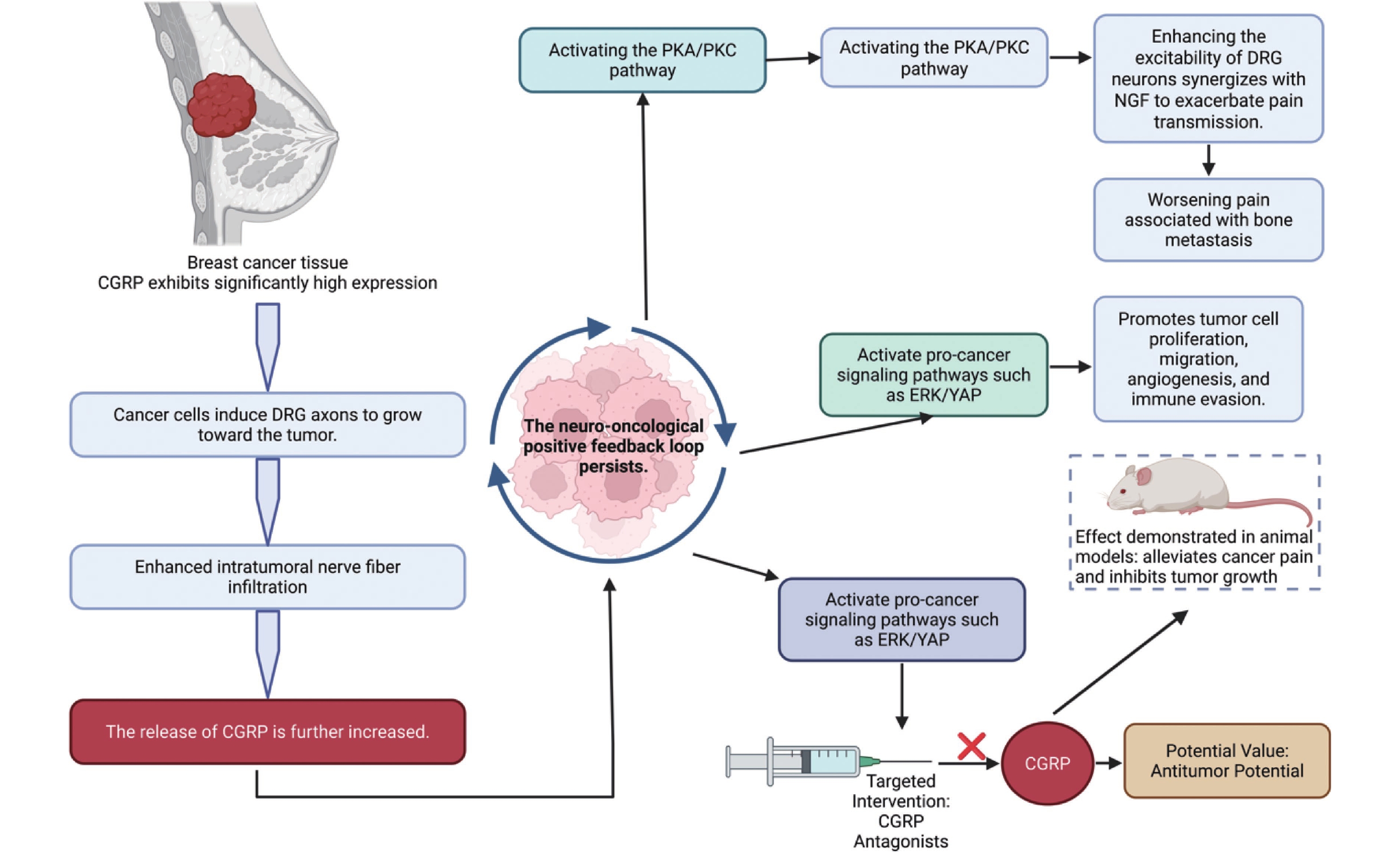 Calcitonin gene-related peptide (CGRP) exerts a central-peripheral synergistic amplification effect in the development and maintenance of cancer pain. This effect is mediated through the activation of signaling pathways, including NGF and BMP2, leading to increased sensory nerve excitability, the promotion of peripheral and central sensitization, and the formation of a "pain-tumor progression" positive feedback loop with the tumor microenvironment. Preclinical evidence has demonstrated the significant analgesic and anti-tumor potential of CGRP antagonists in models including breast cancer, oral cancer, and pancreatic cancer, among others. Furthermore, CGRP levels are closely correlated with cancer pain intensity, suggesting its potential value as a biomarker and intervention target for targeted cancer pain therapy. This review summarizes the mechanistic roles of CGRP in cancer pain and tumor progression, as well as recent advances in related therapeutic research, and explores future strategies for cancer pain management through targeting the CGRP pathway in combination with existing treatment modalities.