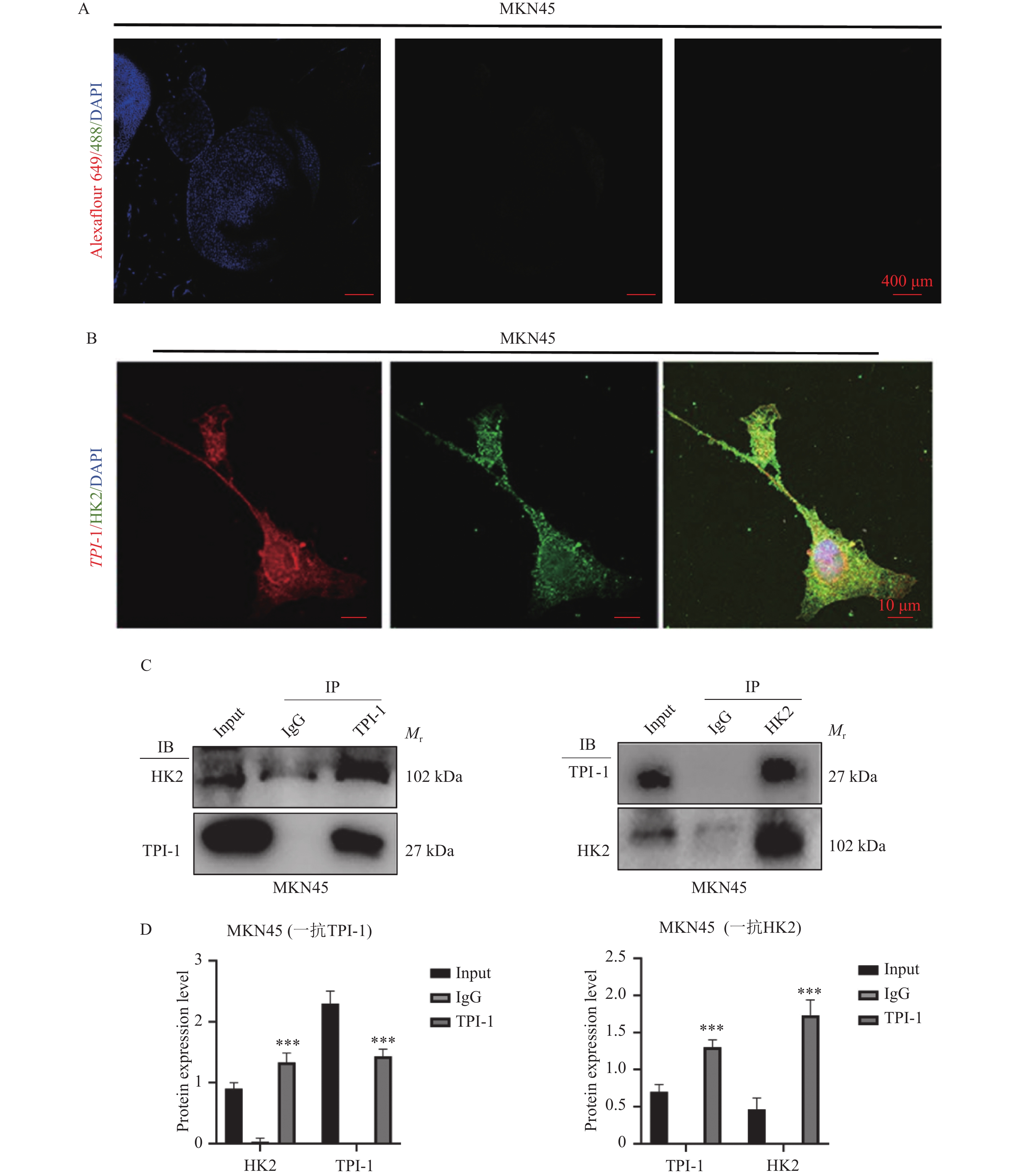Objective To investigate the potential mechanism of TPI-1 intervention in gastric cancer progression from the perspective of glycolytic reprogramming. Methods TPI-1 knockdown and overexpression gastric cancer cell models were constructed. Experimental cells were divided into four groups: shCtrl, shTPI-1, oe-Ctrl, and oe-TPI-1. Cell viability was detected using the CCK-8 assay; invasive capacity was assessed using the Transwell assay; glycolytic capacity was measured using glycolytic stress test to detect ECAR reflecting the glycolytic capacity of different groups of gastric cancer cells; Western blot was used to analyze the expression levels of apoptosis-related, invasion-related, and glycolysis-related characteristic markers in different groups; immunofluorescence and co-IP experiments were performed to verify the colocalization and binding relationship between TPI-1 and HK2. Results Compared with the shCtrl group, the shTPI-1 group showed reduced cell proliferation and invasion capacity (P < 0.01); compared with the oe-Ctrl group, the oe-TPI-1 group demonstrated enhanced proliferation and invasion capacity (P < 0.01); after TPI-1 knockdown, both basal glycolytic capacity and maximum glycolytic capacity were decreased (P < 0.01); in the shTPI-1 group, protein levels of glycolytic key enzymes HK2 and PKM2 were significantly reduced (P < 0.01), and MMP-2, MMP-9, N-cadherin, Bcl-2, and COX4I1 were significantly downregulated (P < 0.01), while NOX4, E-cadherin, Bax, and cleaved caspase-3 were significantly upregulated (P < 0.01); the oe-TPI-1 group showed opposite trends; immunofluorescence analysis revealed colocalization of TPI-1 and HK2 within cells; co-immunoprecipitation preliminarily confirmed that TPI-1 and HK2 may interact. Conclusion TPI-1 promotes gastric cancer progression by interacting with HK2, continuously activating the initiation step of glycolysis, and promoting glycolysis reprogramming.