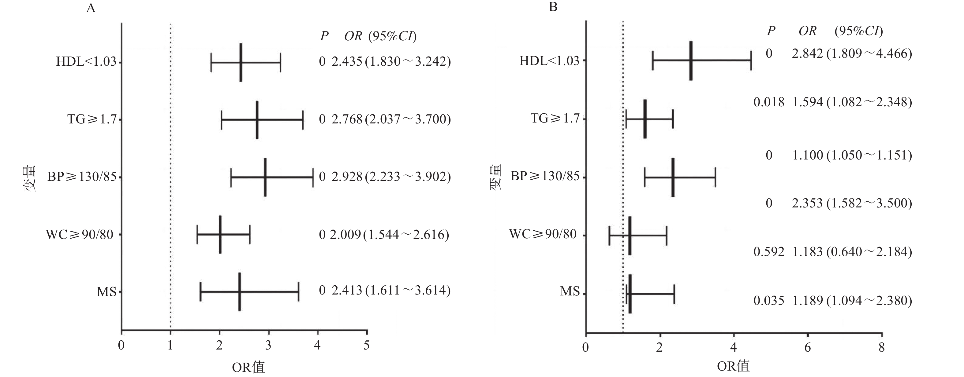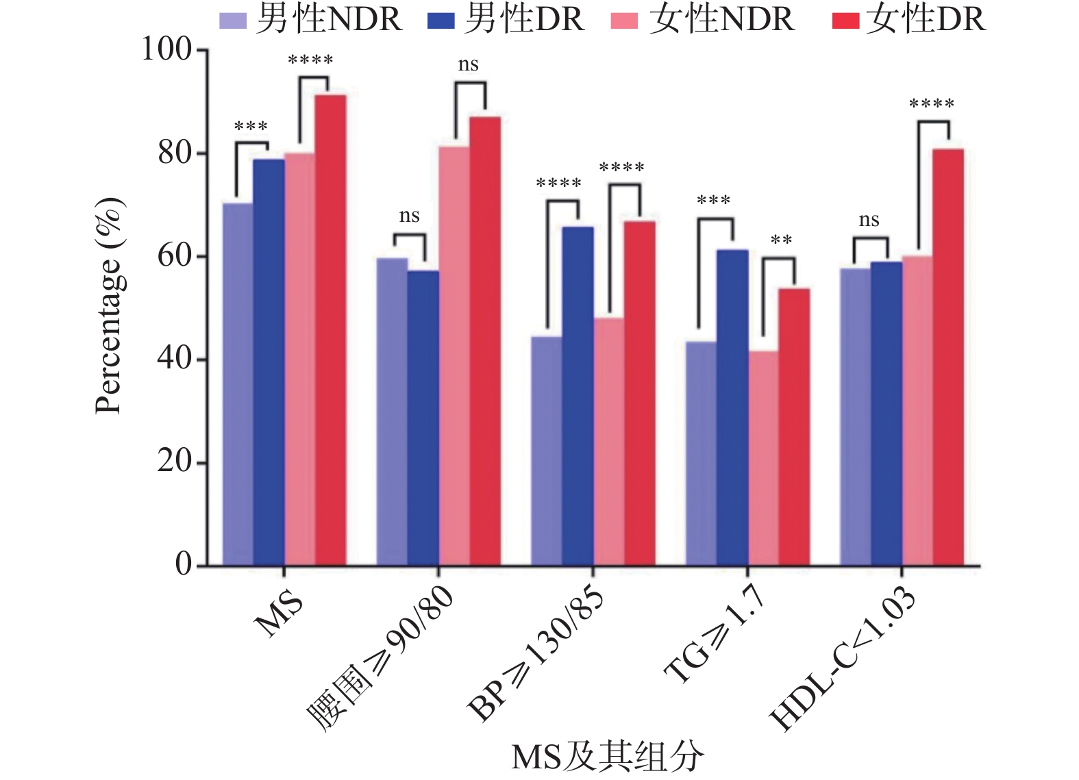 Objective To analyze the correlation between metabolic syndrome (MS) and its components with the risk of diabetic retinopathy (DR) in patients with type 2 diabetes mellitus (T2DM). Methods A retrospective analysis was conducted on clinical data of 2441 T2DM patients hospitalized in the Departments of Ophthalmology and Endocrinology at the Second Affiliated Hospital of Kunming Medical University from January 2019 to October 2024. Based on fundoscopic findings, enrolled patients were divided into DR group (n = 619) and NDR group (n = 1591). Univariate analysis was used to compare the detection rates of metabolic syndrome (MS) and its components between the two patient groups. Logistic regression analysis was performed to assess the correlation between MS and its components with the risk of diabetic retinopathy (DR). Results According to the NECP-ATP III criteria, among 2210 T2DM patients, 619 had DR, and 514 had concurrent MS, with a detection rate of 83.00%. The detection rates of concurrent MS, elevated blood pressure, elevated triglycerides (TG), and decreased high-density lipoprotein cholesterol (HDL-C) in the DR group were all significantly higher than those in the NDR group, with statistically significant differences (P < 0.05). After adjusting for confounding factors in multivariate Logistic regression analysis, concurrent MS, hypertension, elevated TG, and decreased HDL-C were all significantly positively associated with the risk of DR, with OR values and 95%CI of 2.025 (1.462~2.806), 2.879 (2.316~3.578), 2.259 (1.803~2.829), and 2.500 (1.993~3.136), respectively. Conclusion MS is associated with the occurrence of DR in T2DM patients, with elevated blood pressure, elevated TG, and reduced HDL-C being particularly significant. As the number of MS components increases, the risk of DR shows an increasing trend.